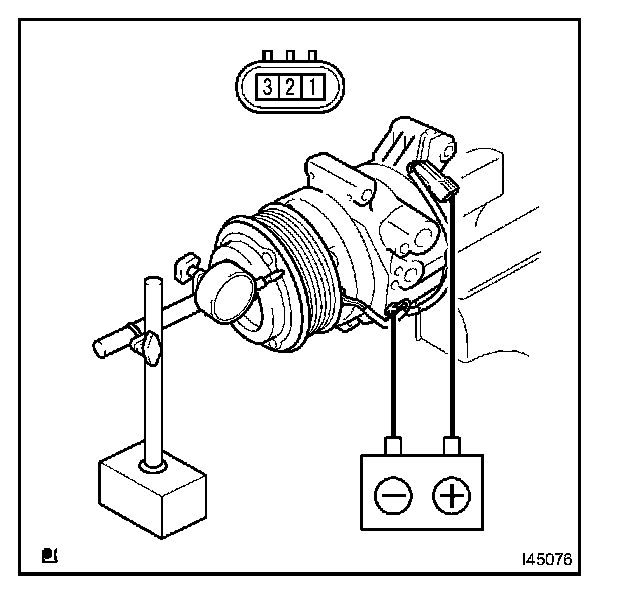 c. Connect the battery positive lead to terminal 1 (MG+) of the magnet clutch connector and the negative lead to the earth wire. Turn the magnet clutch on and off and measure the clearance.