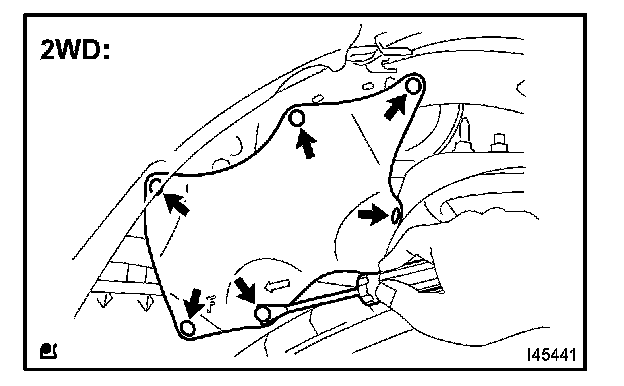 b. Using a clip remover, disengage the 6 clips and remove the front fender apron seal upper. (2WD)