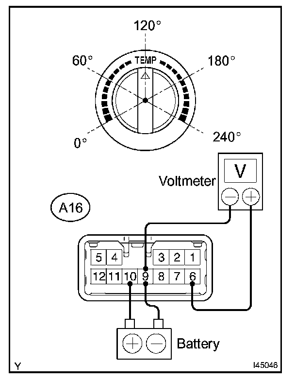 2. Connect the positive (+) tester probe of a voltmeter to terminal 6 (AMSW) and the negative (-) tester probe to terminal 9 (GND), then check the voltage.