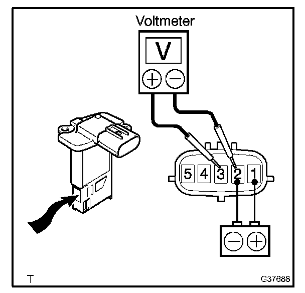 2. Using a voltmeter, connect the positive (+) tester prove to terminal 3 (VG) and the negative (-) tester prove to terminal 2 (E2G).
