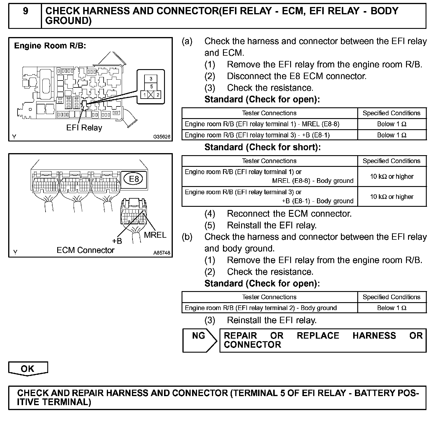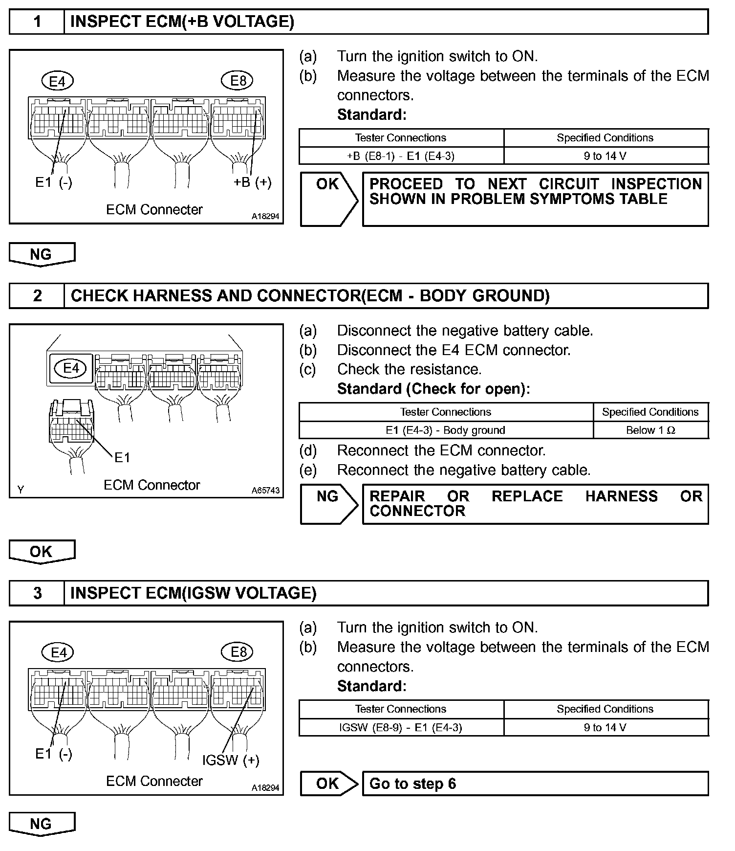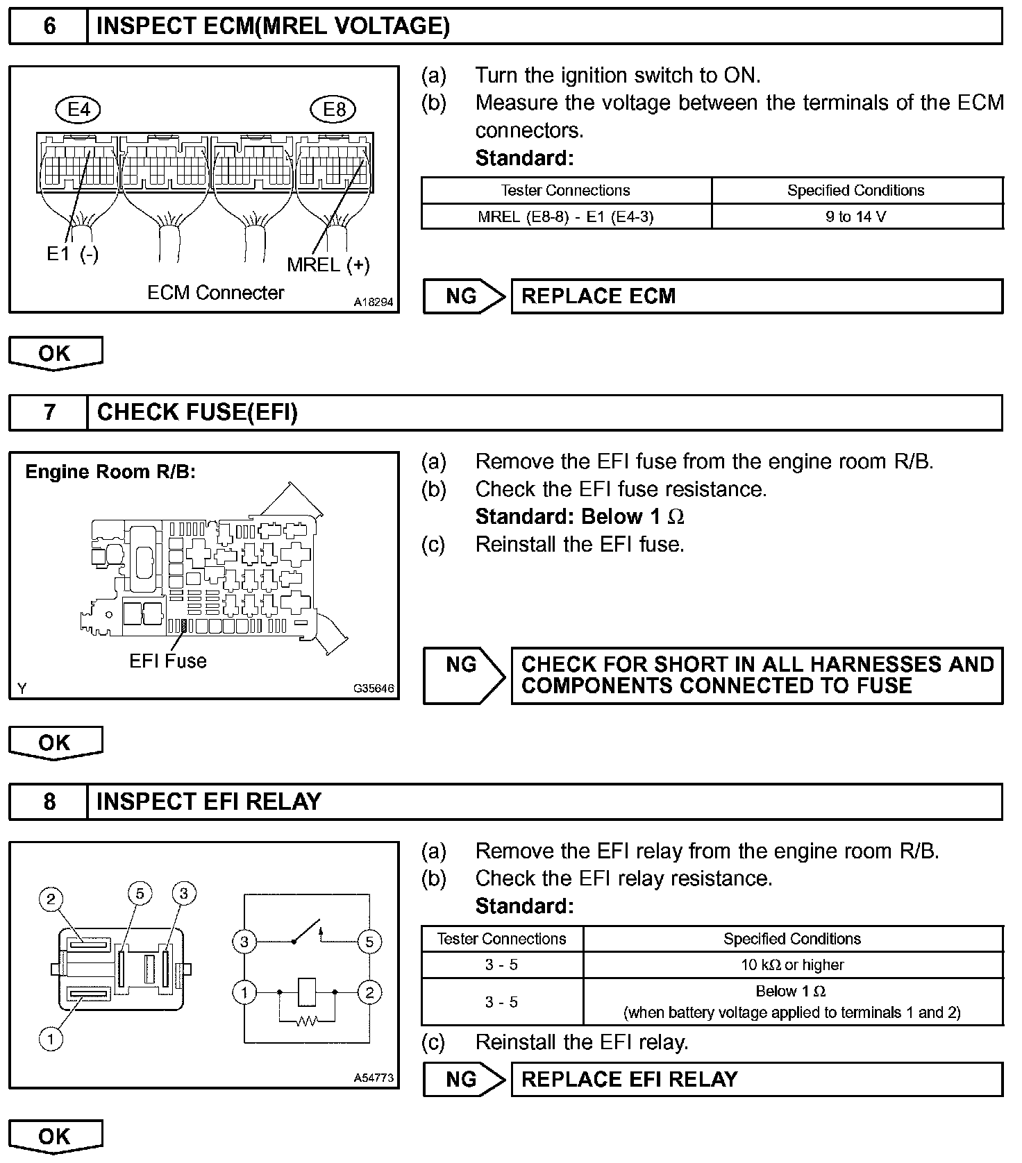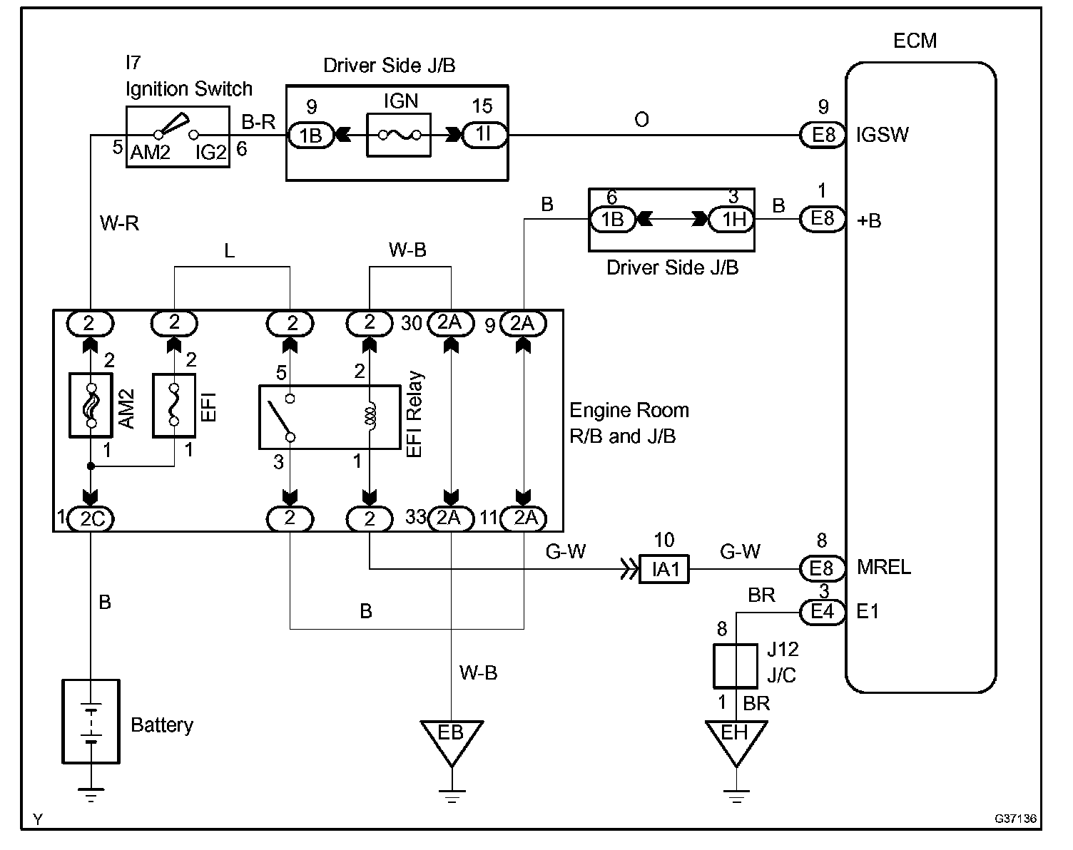 When the ignition switch is turned to ON, the battery voltage is applied to terminal IGSW of the ECM. The ECM MREL output signal causes a current to flow to the coil, closing the contacts of the EFI relay and supplying power to terminal +B of the ECM.