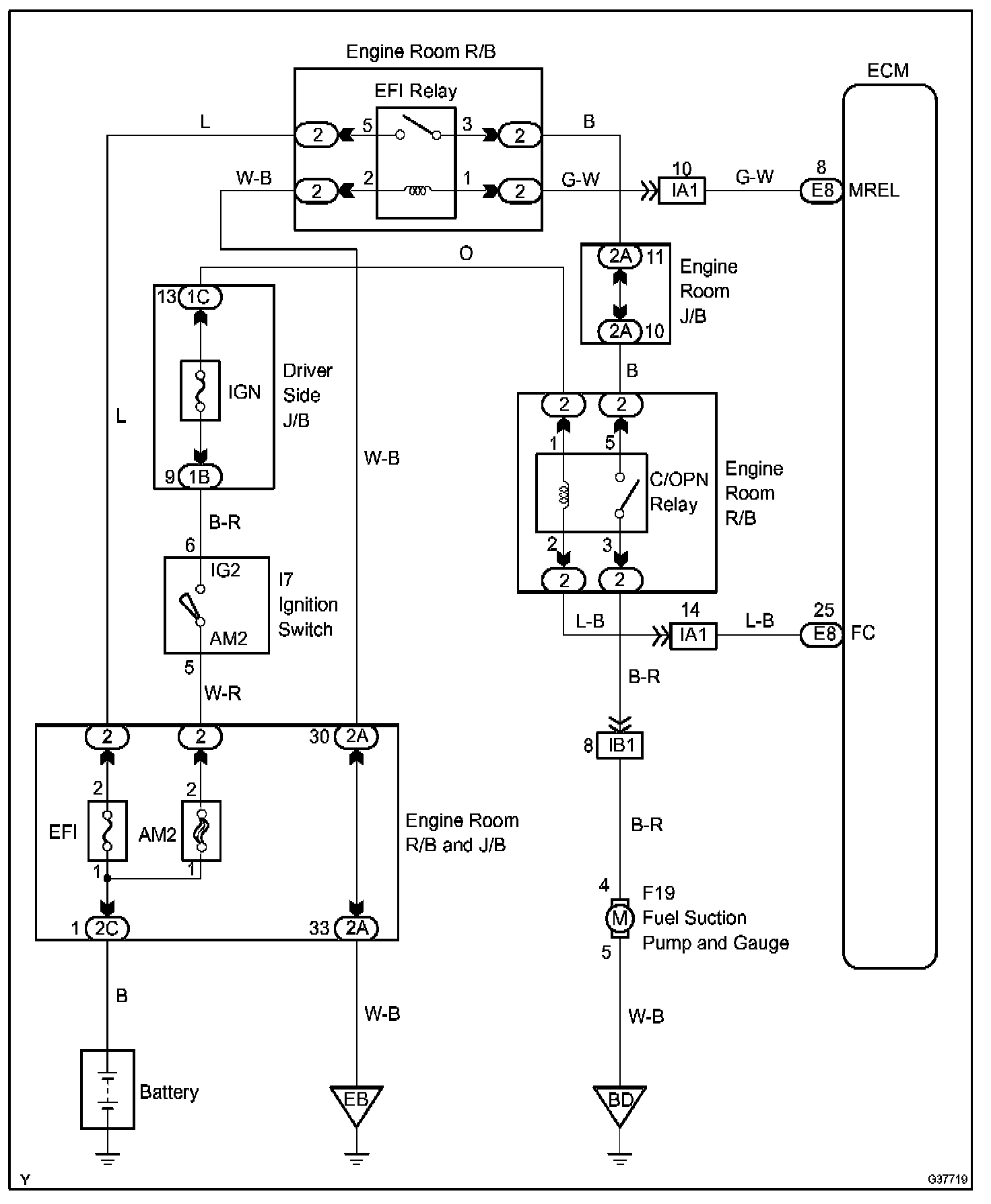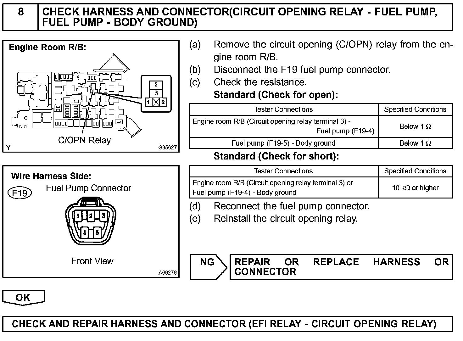 When the STA and NE signals are received by the ECM, Tr (power transistor) is switched on, allowing a current to flow into the circuit opening relay coil. The circuit opening relay switches on, power is supplied to the fuel pump and the fuel pump operates.