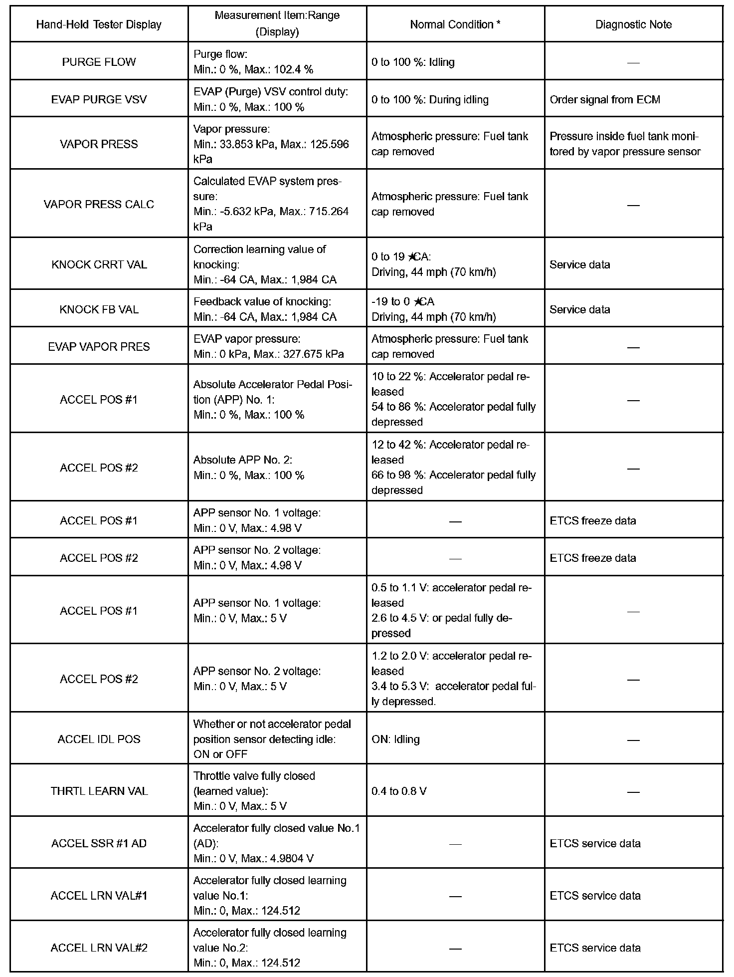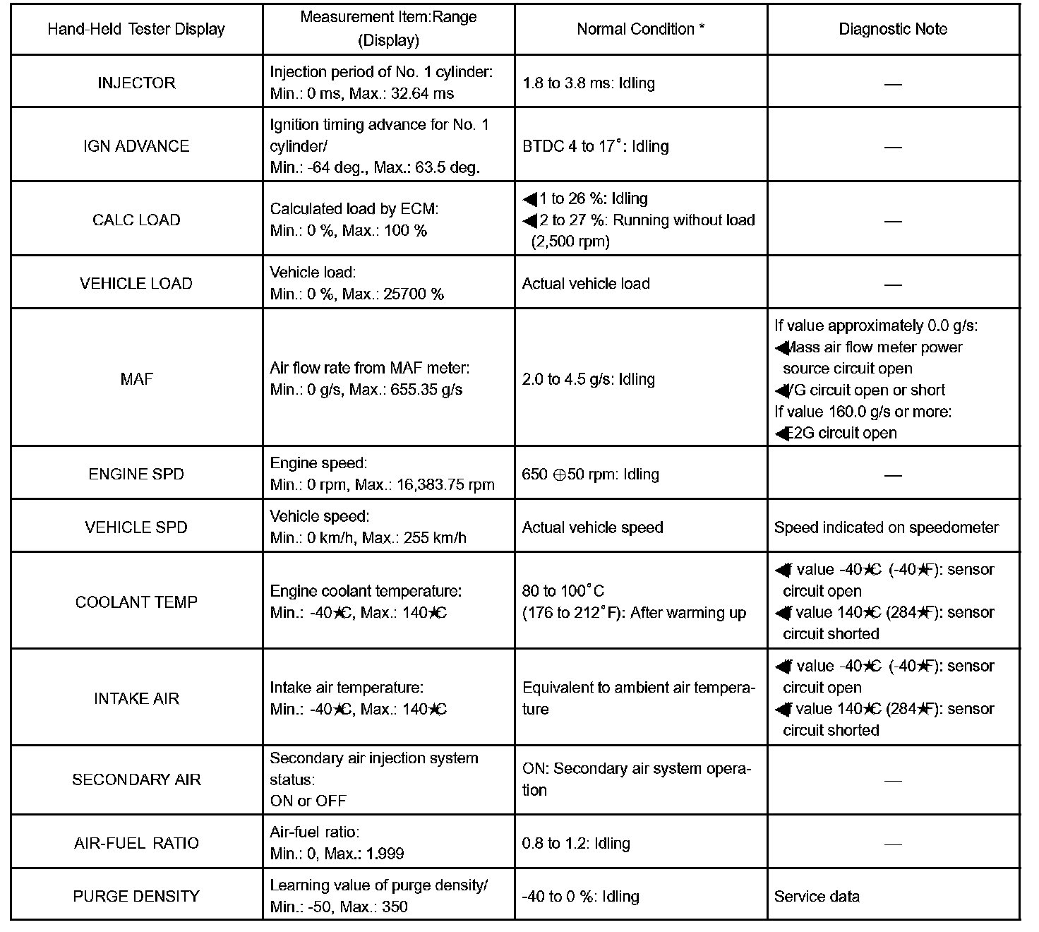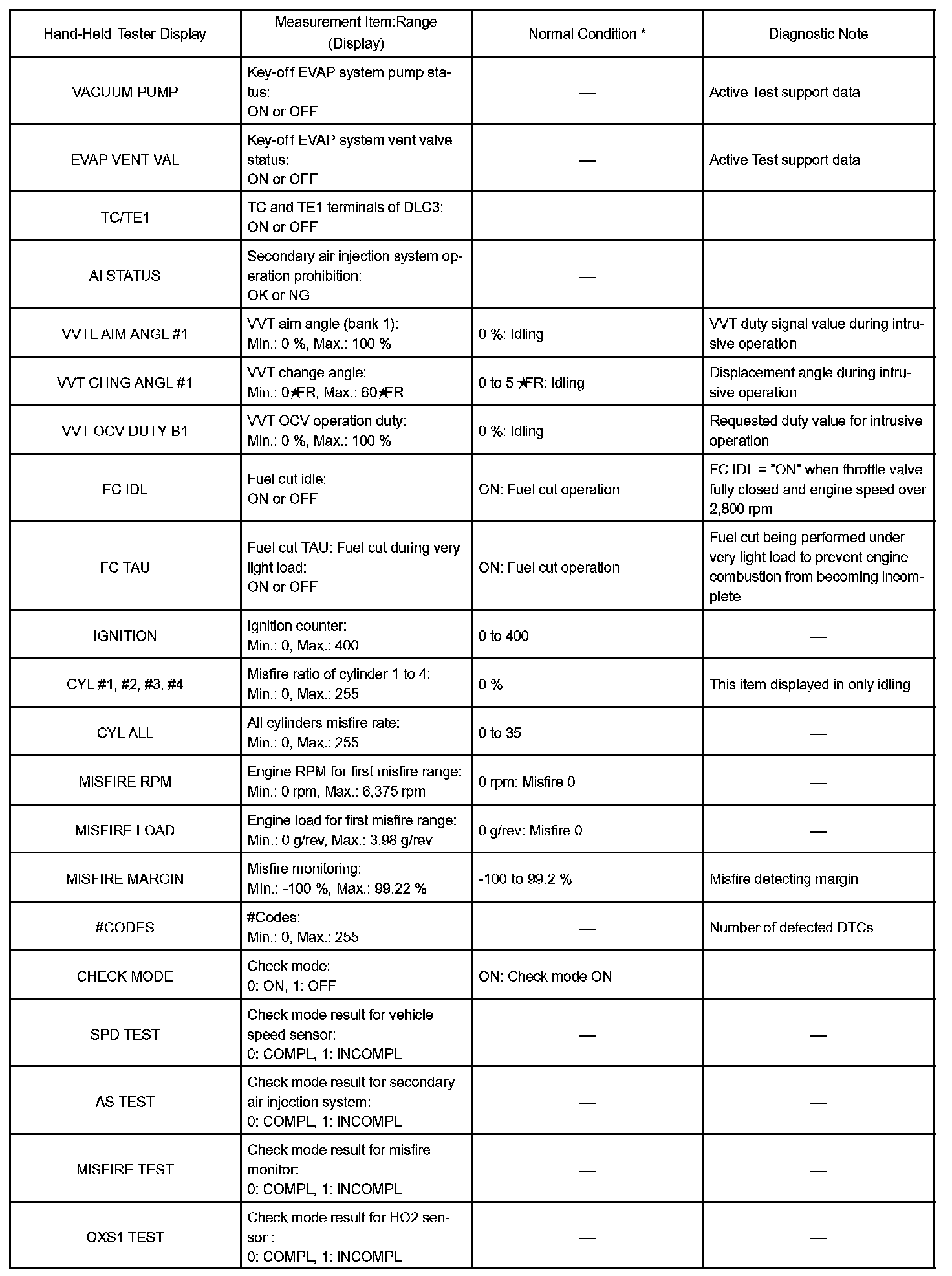 DATA LISTHINT: By reading the DATA LIST displayed on a hand-held tester, you can check values, including those of the switches, sensors, and actuators, without removing any parts. Reading the DATA LIST as the first step of troubleshooting is one method of shortening diagnostic time.