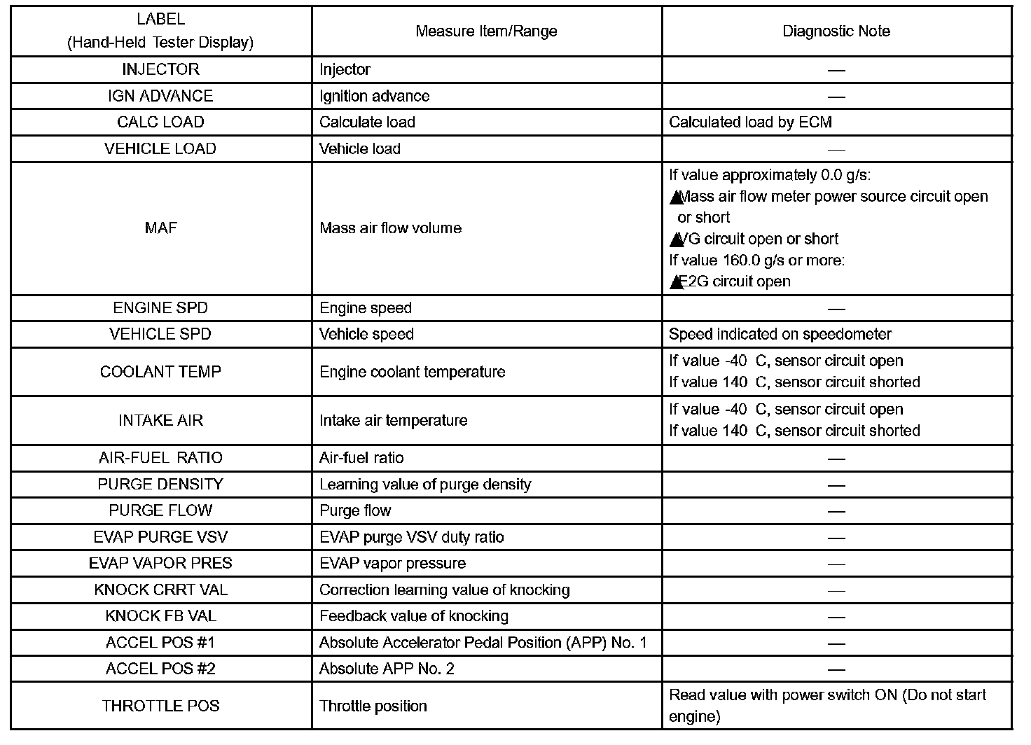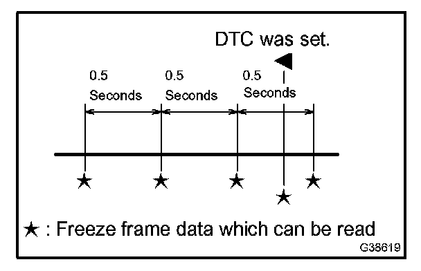 The ECM records engine conditions in the form of freeze frame data every 0.5 seconds. Using the hand-held tester, five separate sets of freeze frame data, including the data values at the time when the DTC was set, can be checked.
