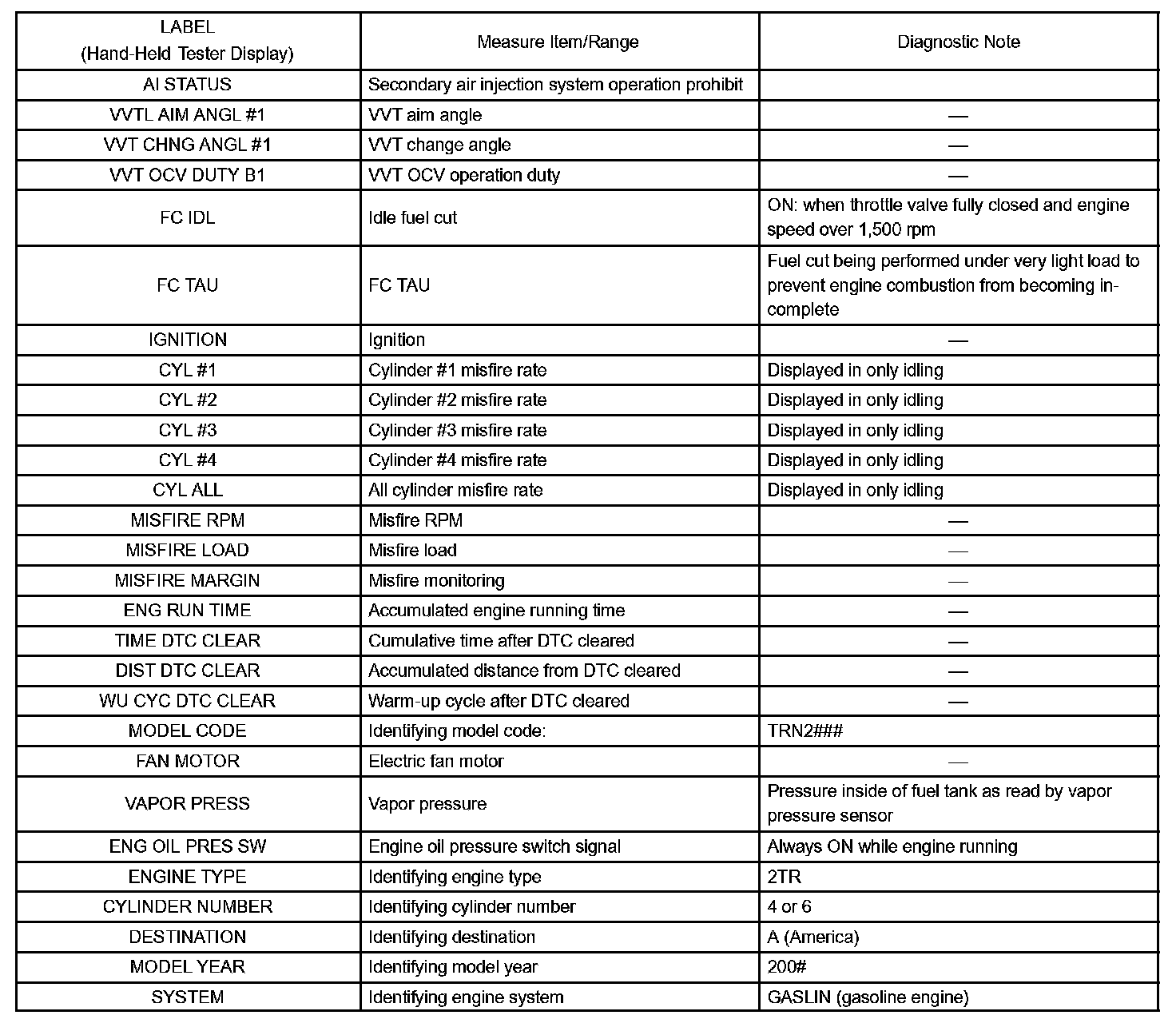 Freeze frame data record the engine conditions (fuel system, calculated load, engine coolant temperature, fuel trim, engine speed, vehicle speed, etc.) when a malfunction is detected. When troubleshooting, it can help determine if the vehicle was running or stopped, the engine was warmed up or not, the air-fuel ratio was LEAN or RICH, and other data, from the time the malfunction occurred.