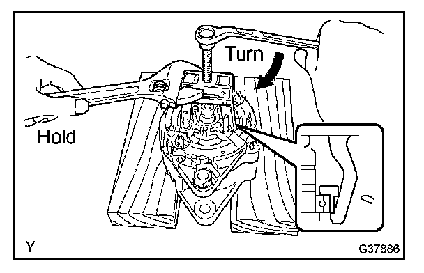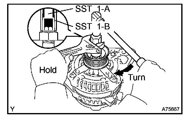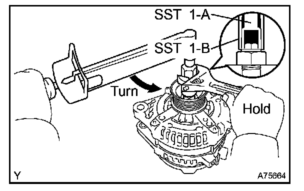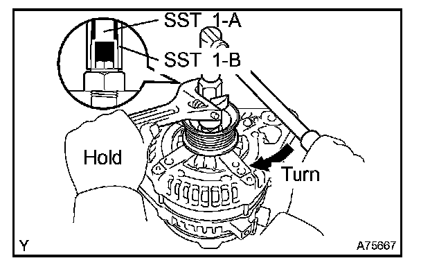 d. To loosen the generator pulley nut, turn SST 1-A in the direction shown in the illustration.