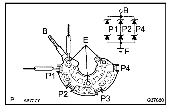 a. Using an ohmmeter, check the continuity between terminals P1, P2, P3, P4 and B, and between P1, P2, P3, P4 and E.