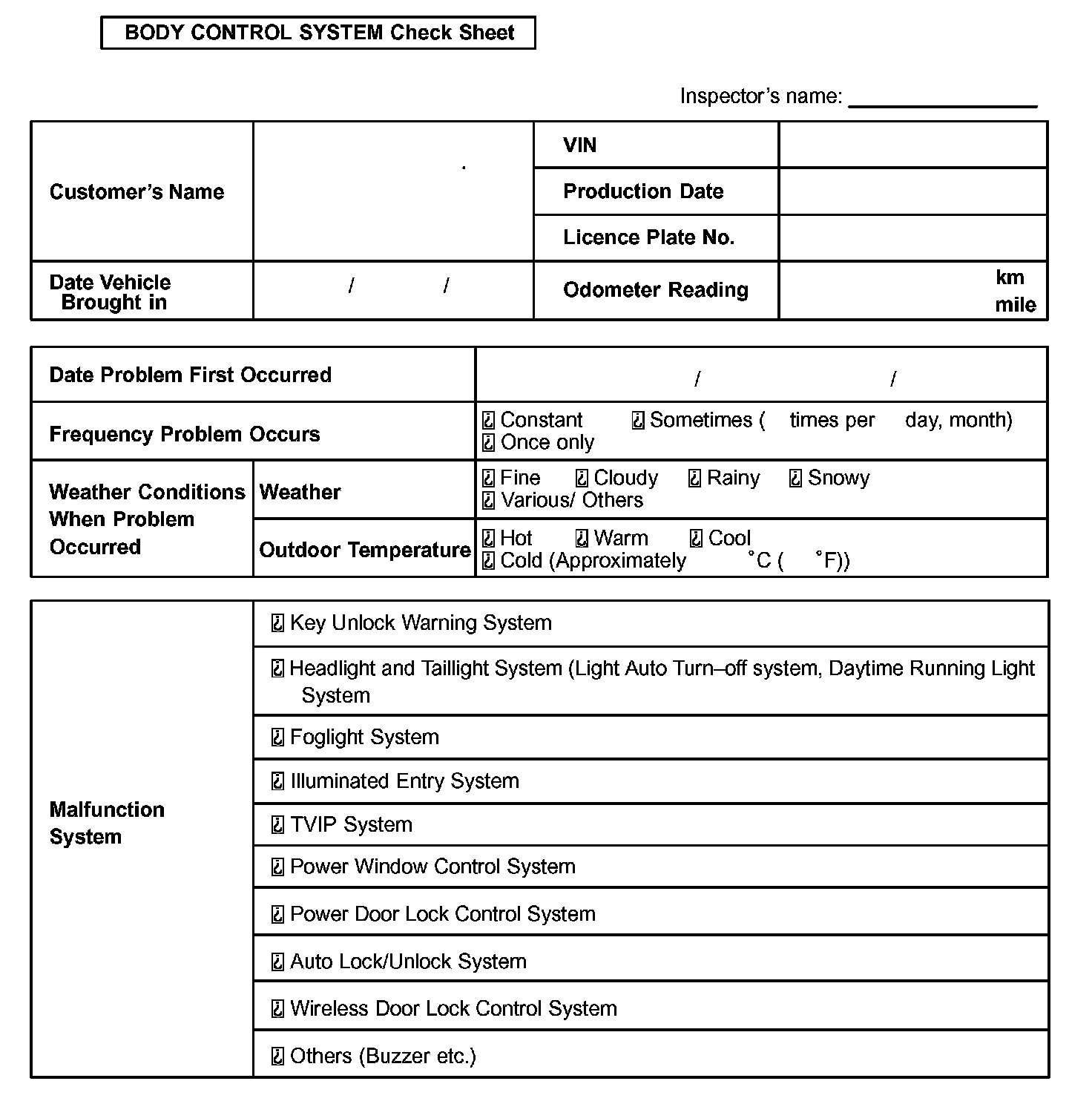 Body Control System Check Sheet: