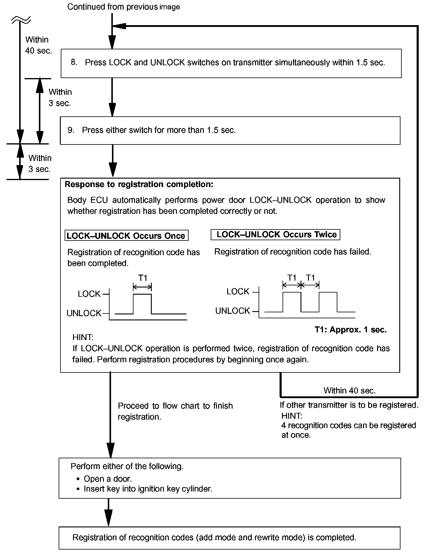 - The add mode is used to register new recognition codes while still retaining codes already registered. This mode is used when a new transmitter is added. If the number of registered codes exceeds 4, the previously registered codes will be erased in order, starting from the first registered code.