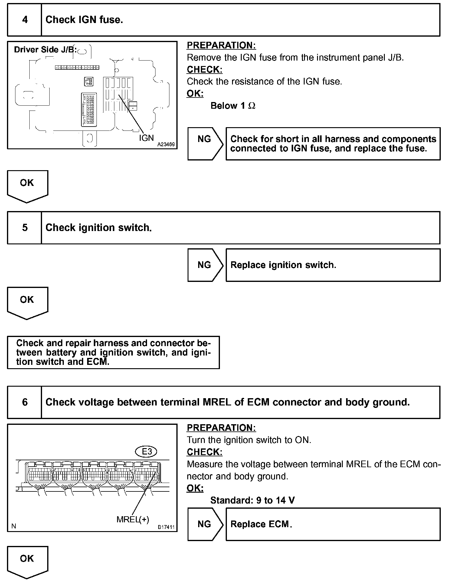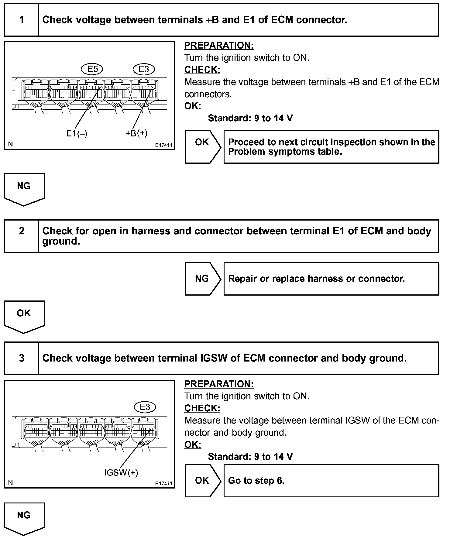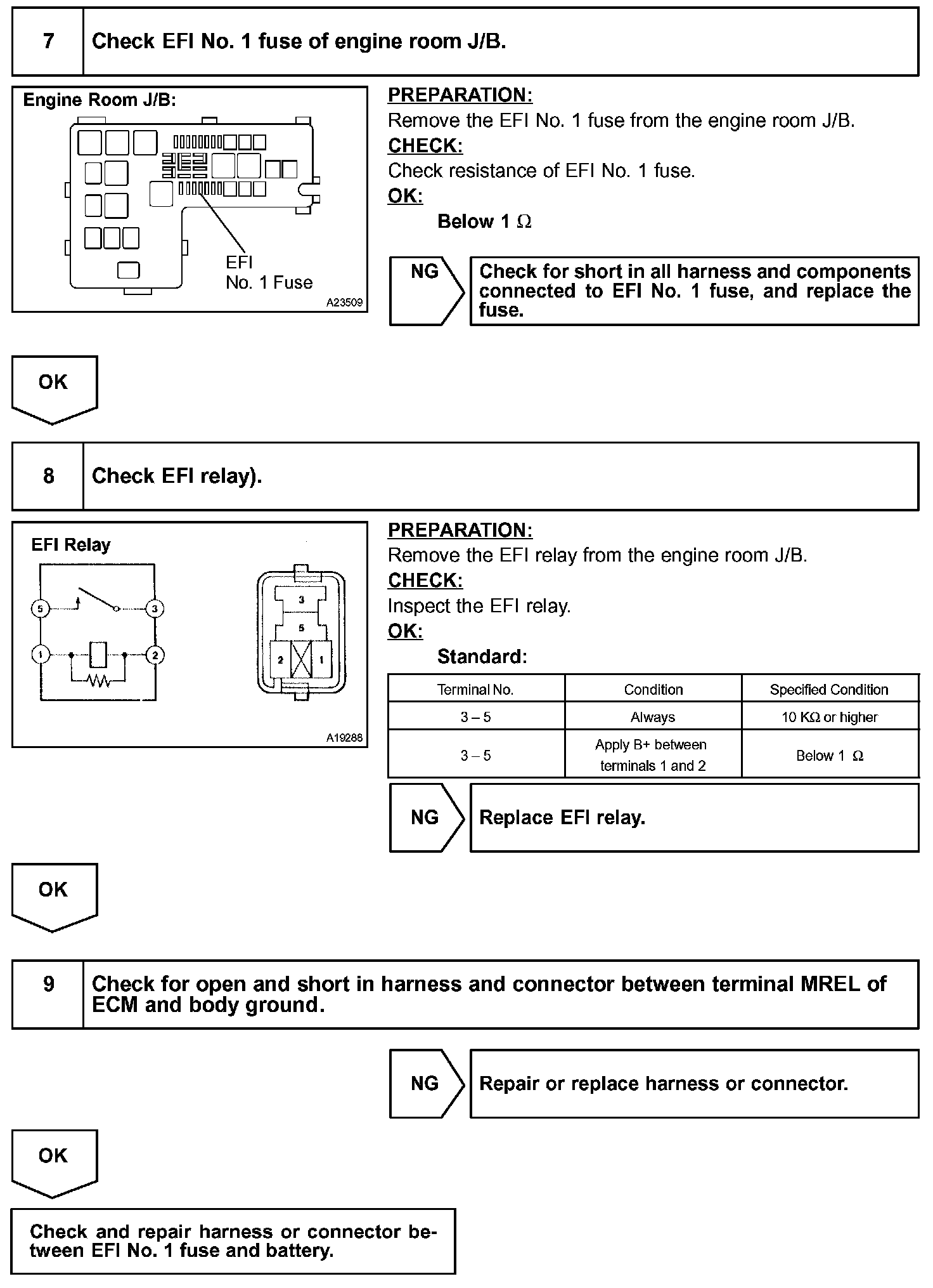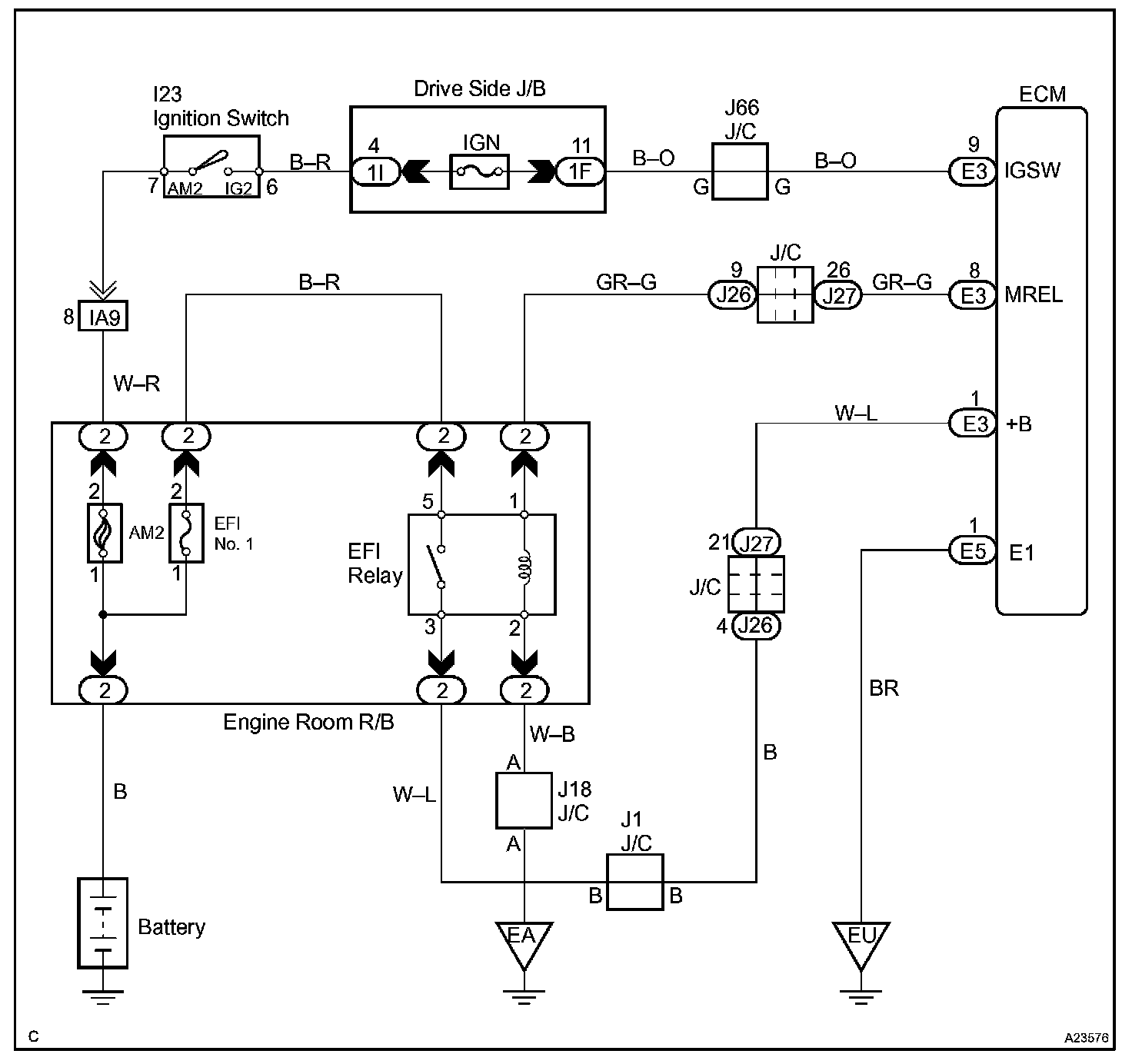 This signal causes current to flow to the coil, closing the contacts of the EFI relay and supplying power to terminal +B of the ECM.