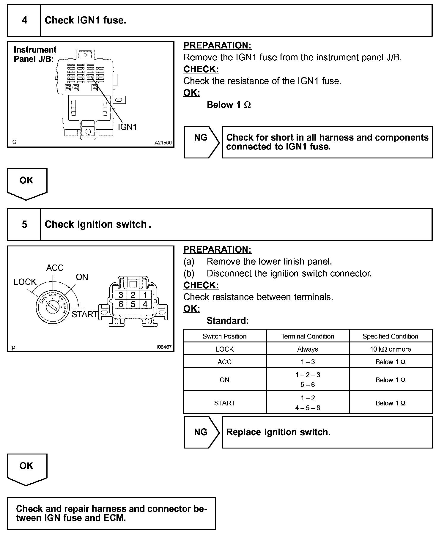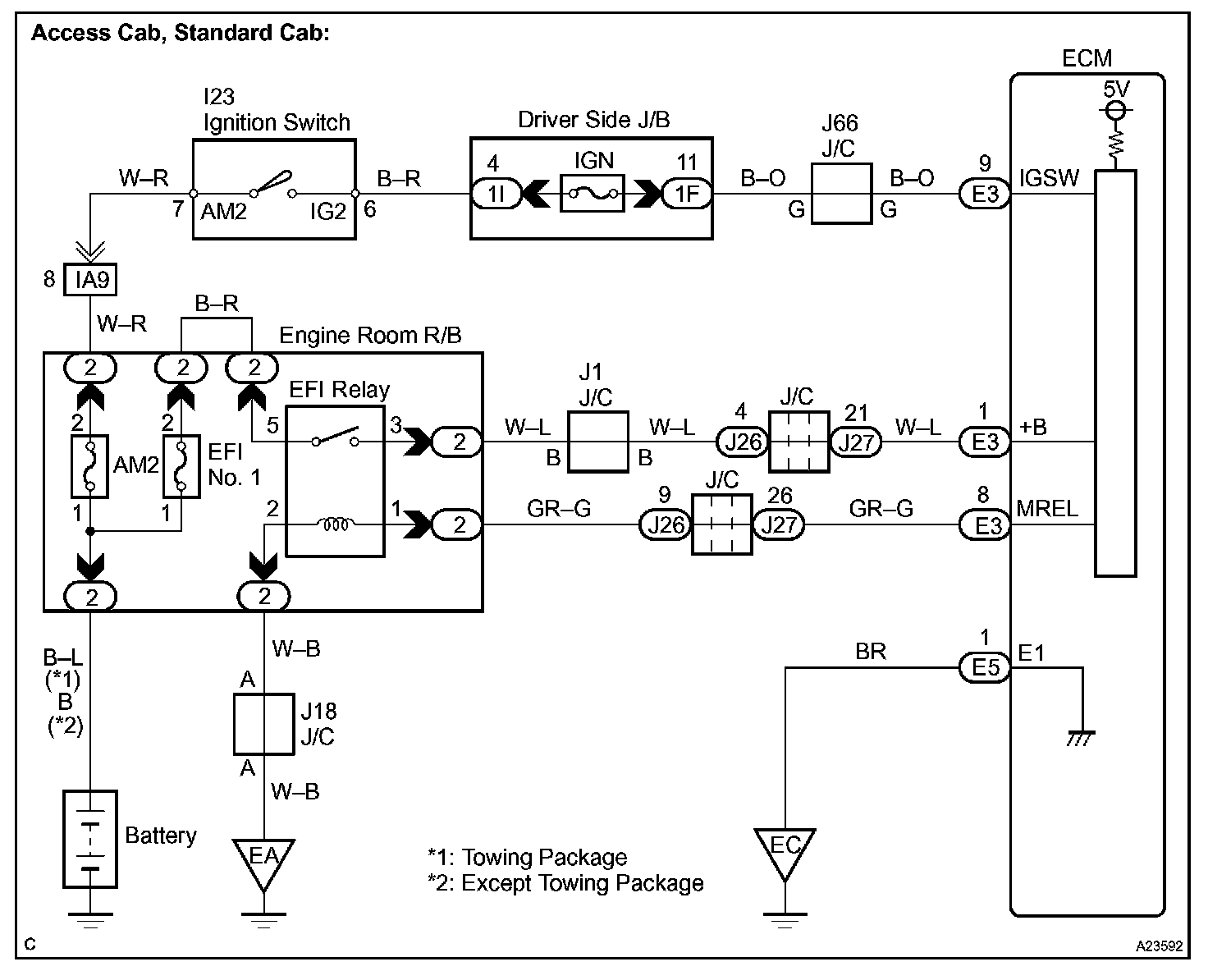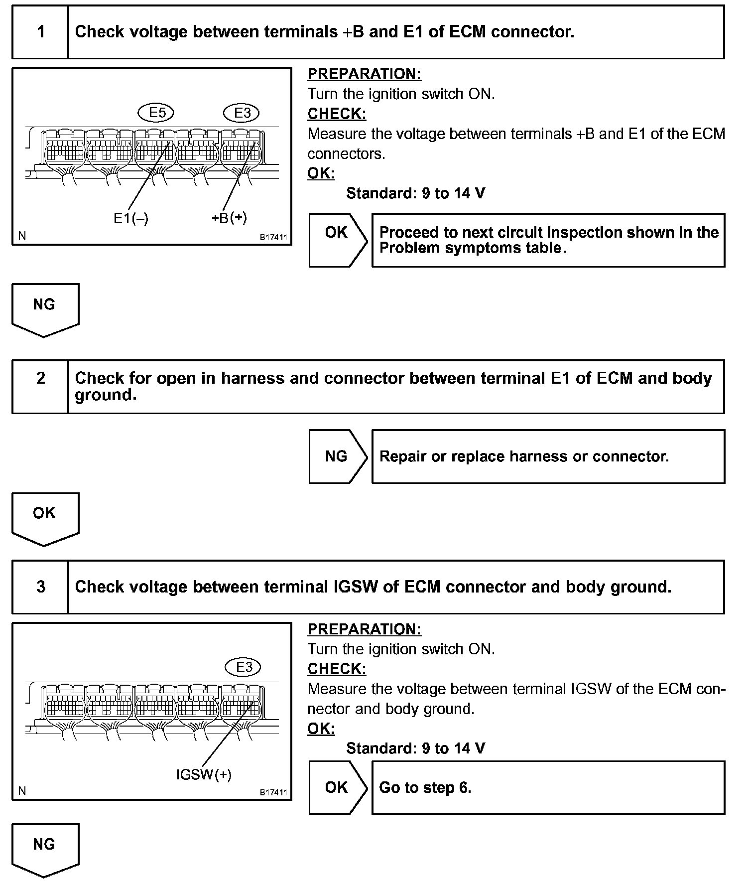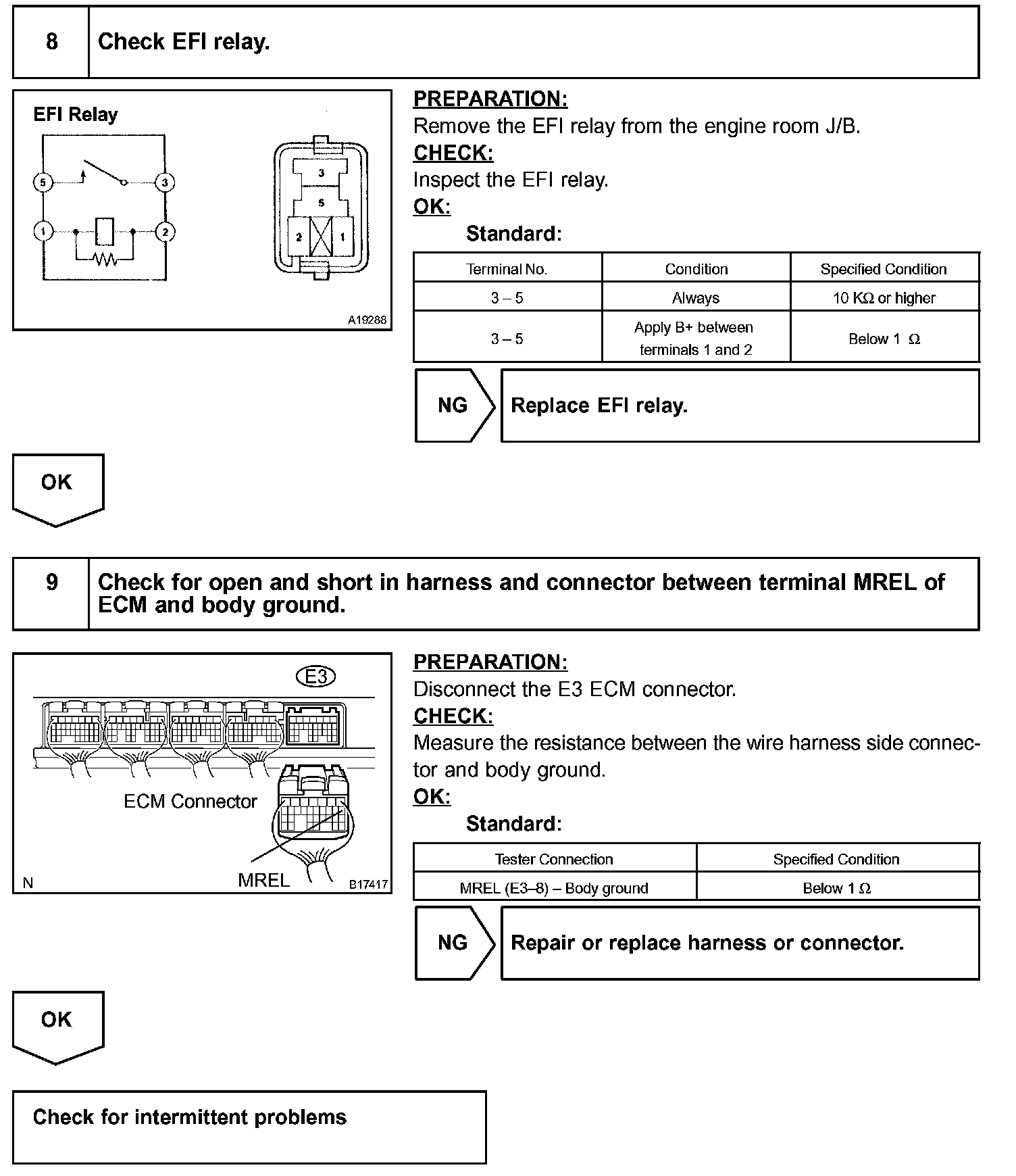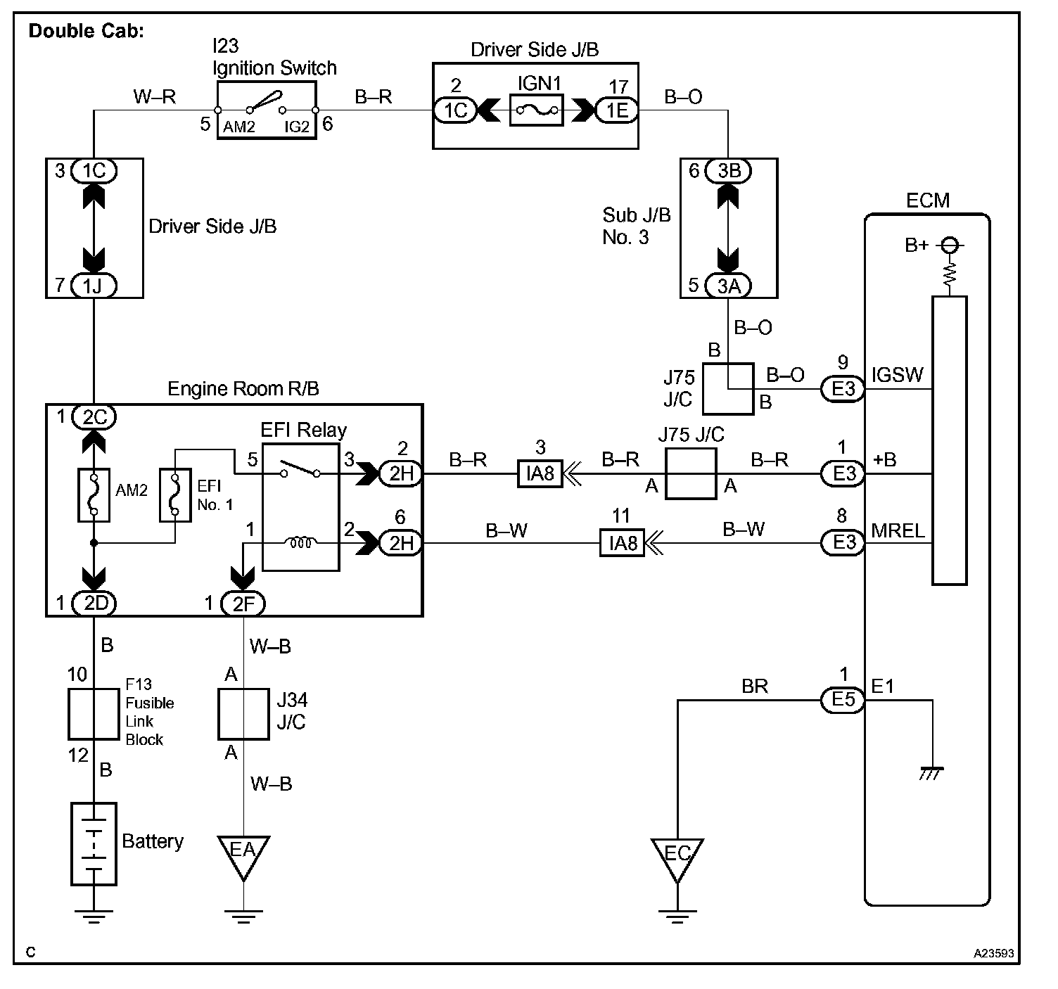 This signal causes current to flow to the coil, closing the contacts of the EFI relay and supplying power to terminal +B of the ECM.