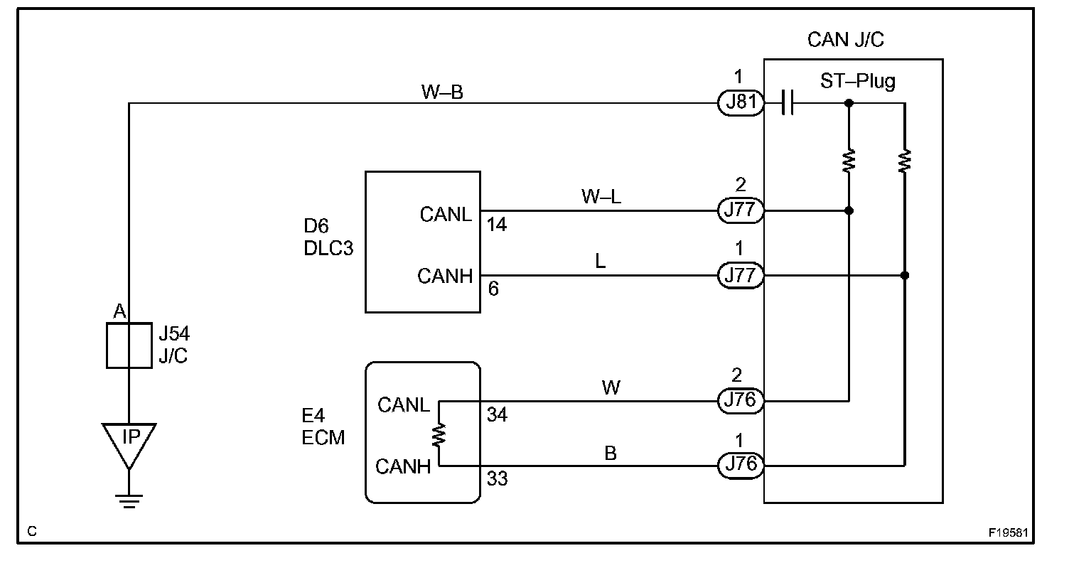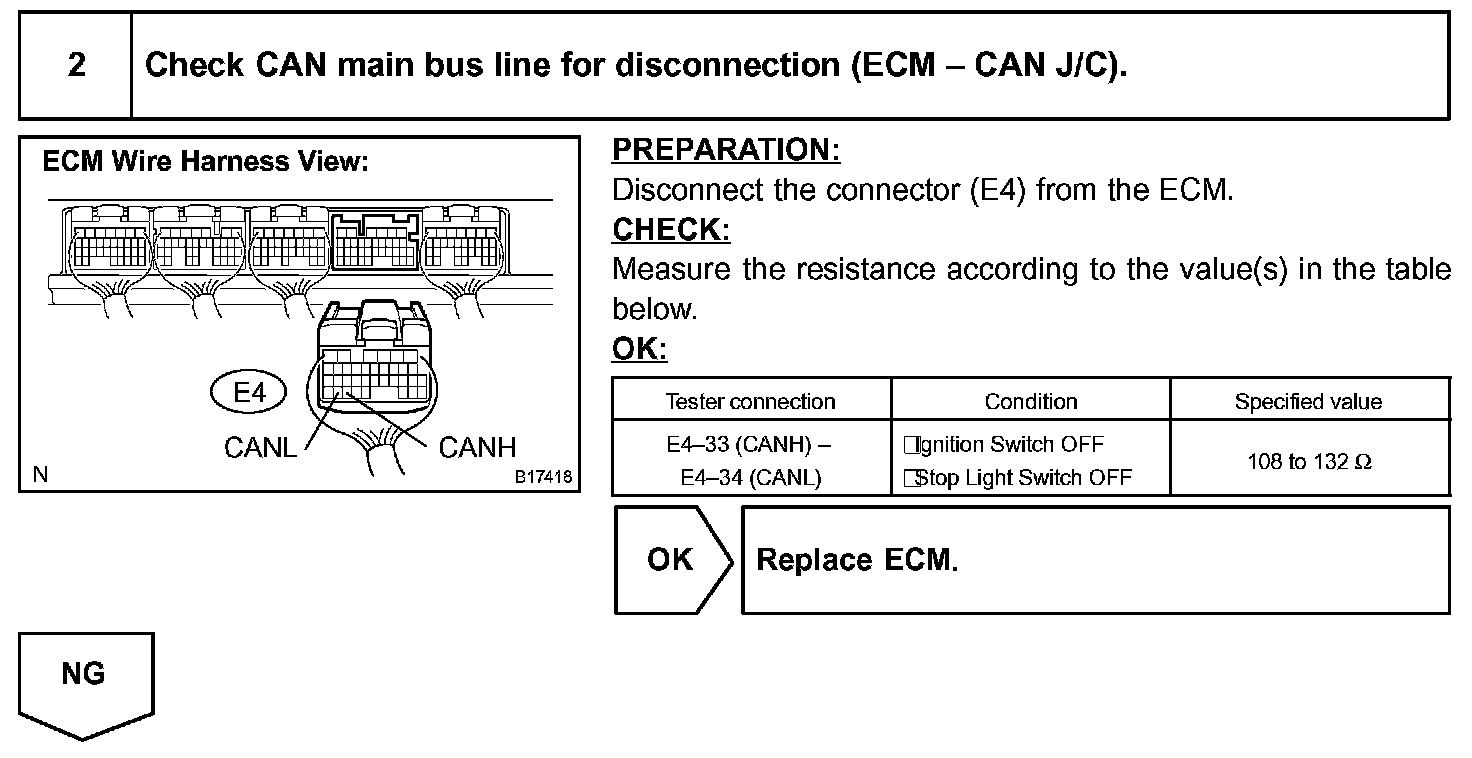 The CAN main bus line and DLC3 sub bus line may have a disconnection when the resistance between terminals 6 (CANH) and 14 (CANL) of the DLC3 is more than 69 Ohm.