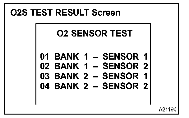 b. On the tester screen, select the following menus: DIAGNOSIS / CARB OBD II / O2S TEST RESULT. A list of the O2S equipped on the vehicle will be displayed.