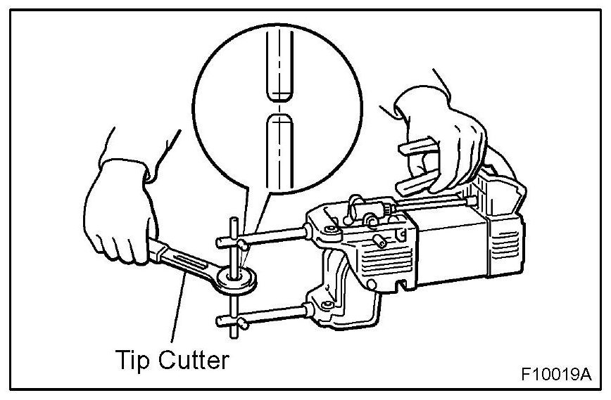 1. When welding panels with a combined thickness of over 3 mm (0.12 in.), use a MIG (Metal Inert Gas) welder for plug welding.