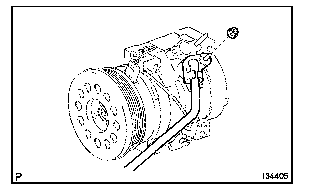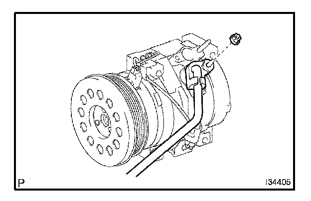 d. Install the suction hose sub-assembly on the compressor and the magnetic clutch with the nut.