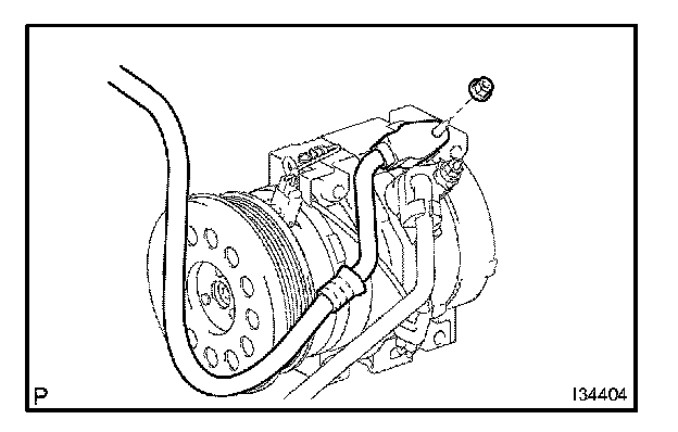 d. Install the discharge hose sub-assembly on the compressor and magnetic clutch with the nut.