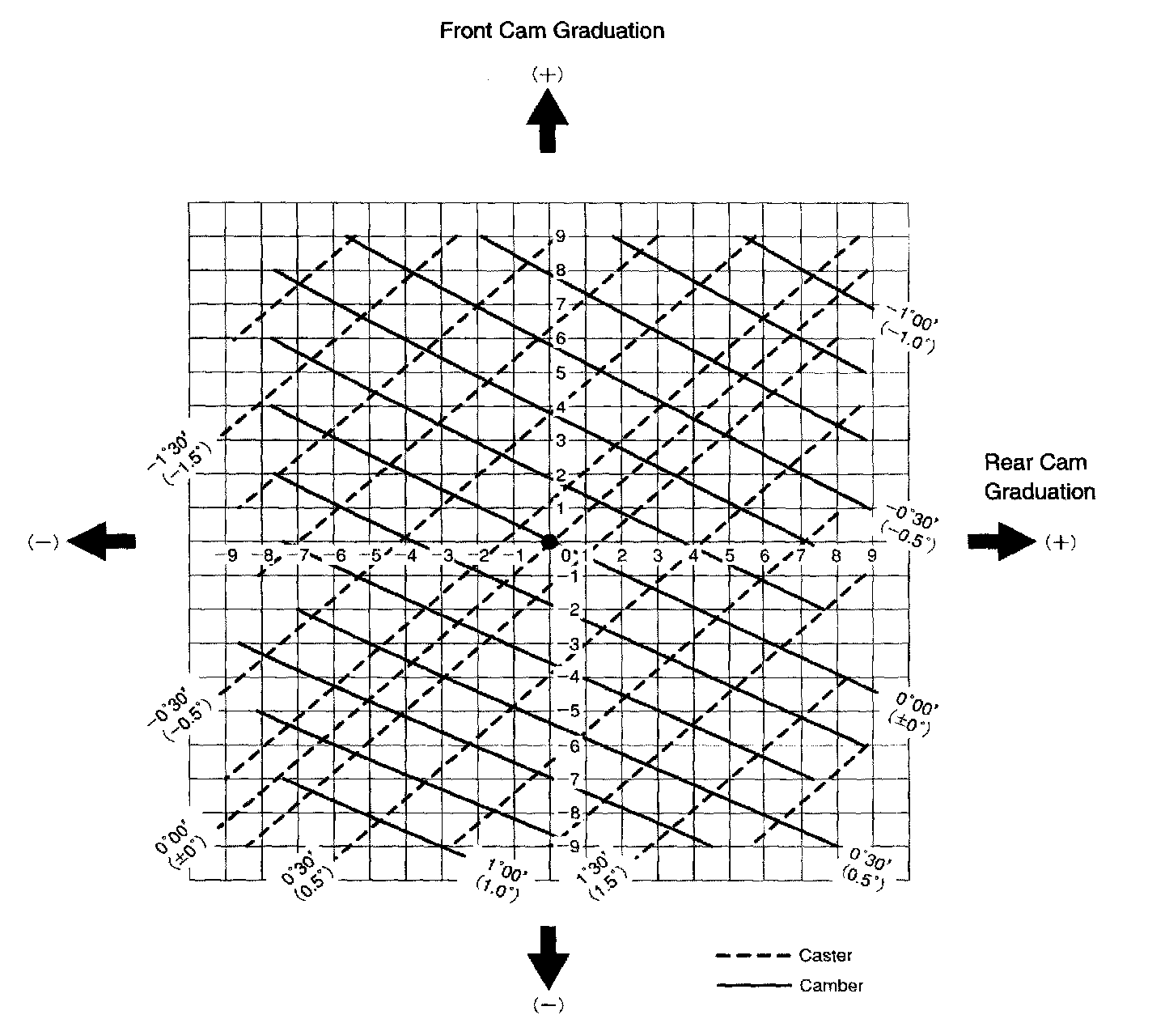 3. As shown in the chart, read the distance from the marked point to 0 point, and adjust the front and/or rear adjusting cams accordingly.