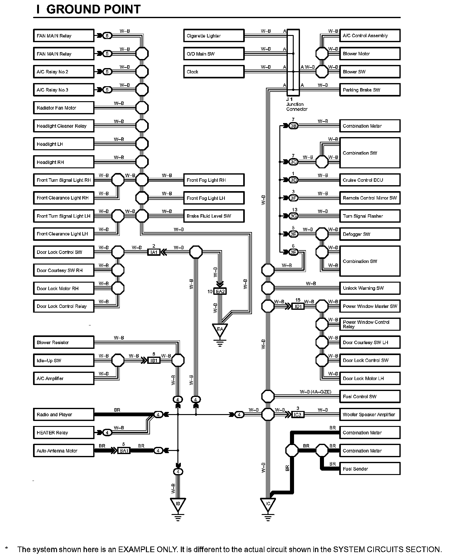 HOW TO READ GROUND POINTSThe ground points circuit diagram shows the connections from all major parts to the respective ground points. When troubleshooting a faulty ground point, checking the system circuits which use a common ground may help you identify the problem ground quickly. The relationship between ground points ((EA), (IB) and (IC) as shown) can also be checked this way.