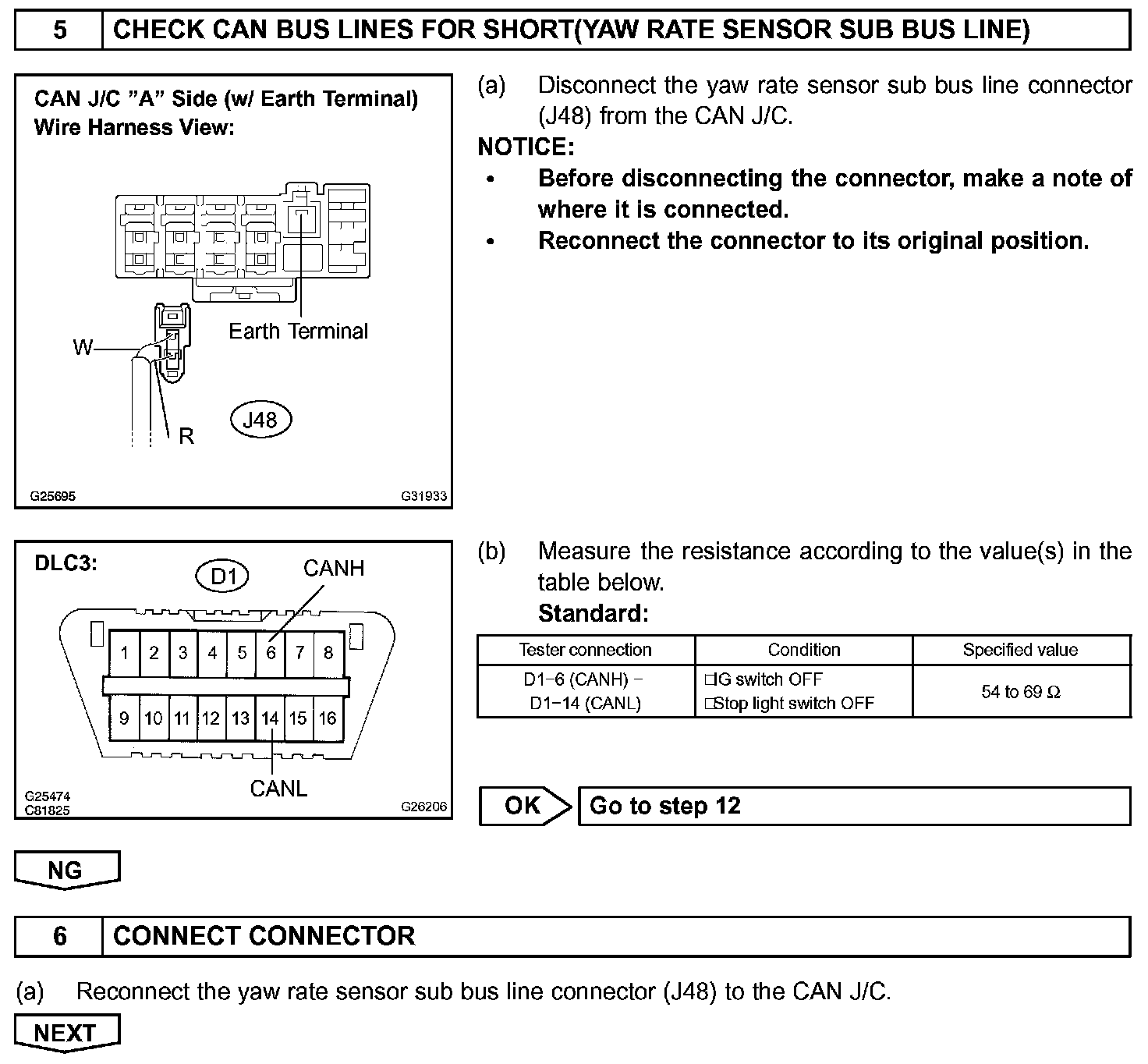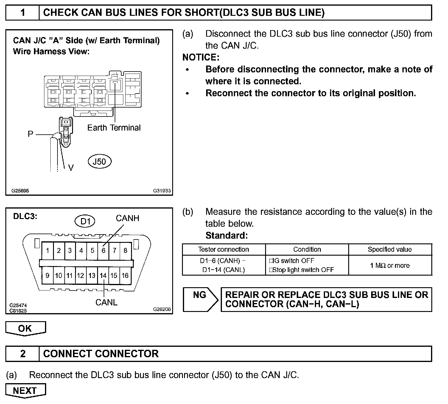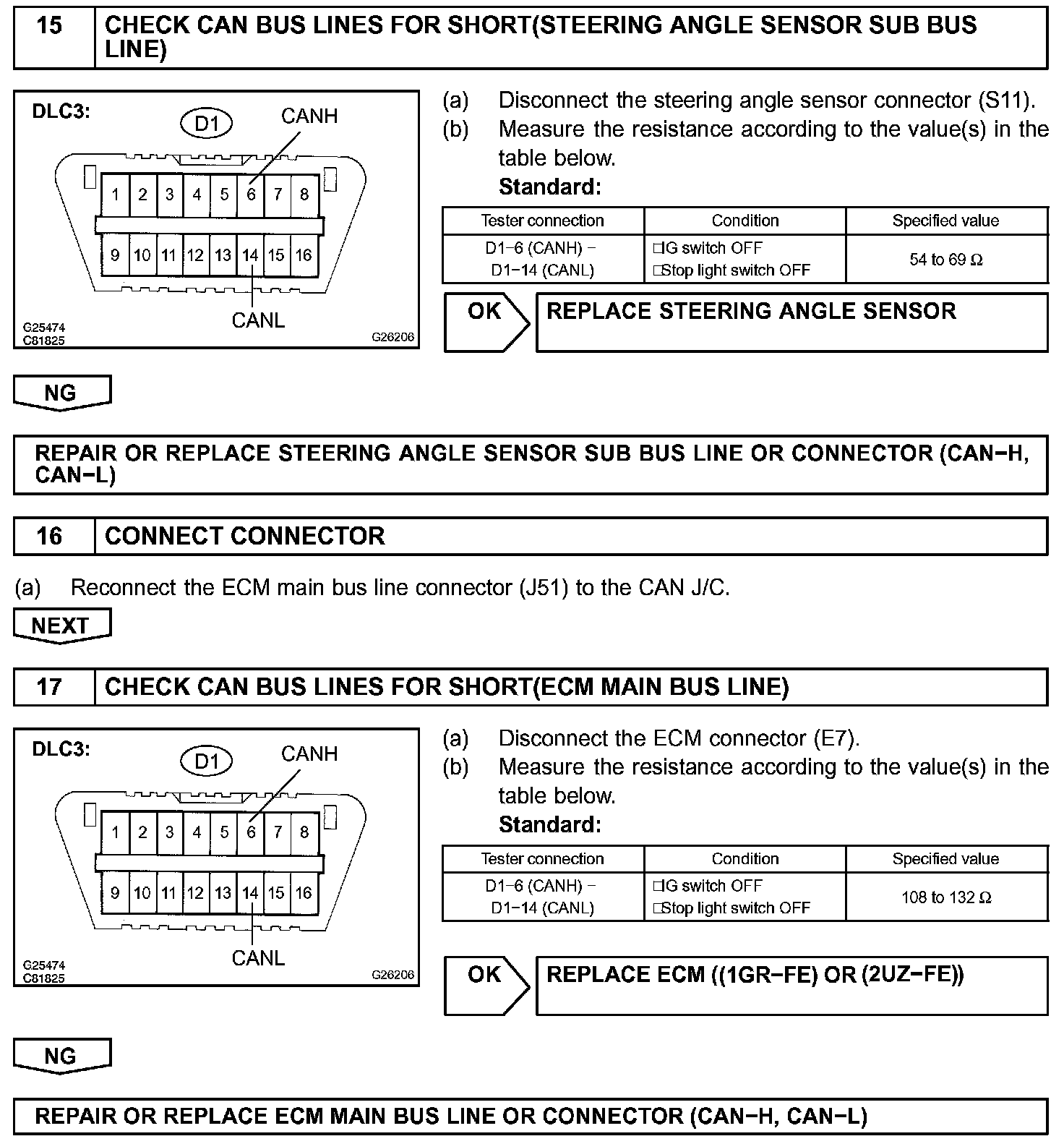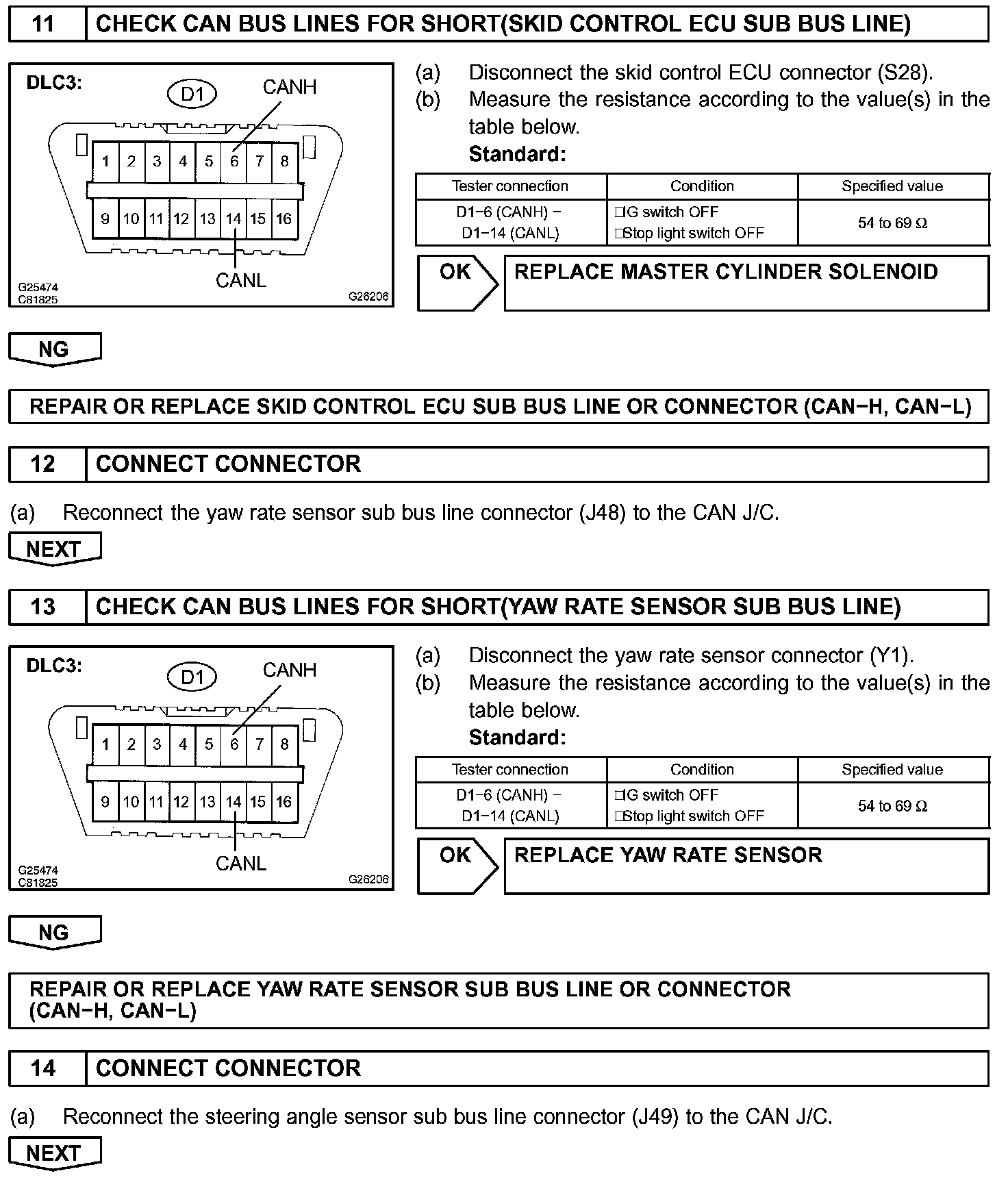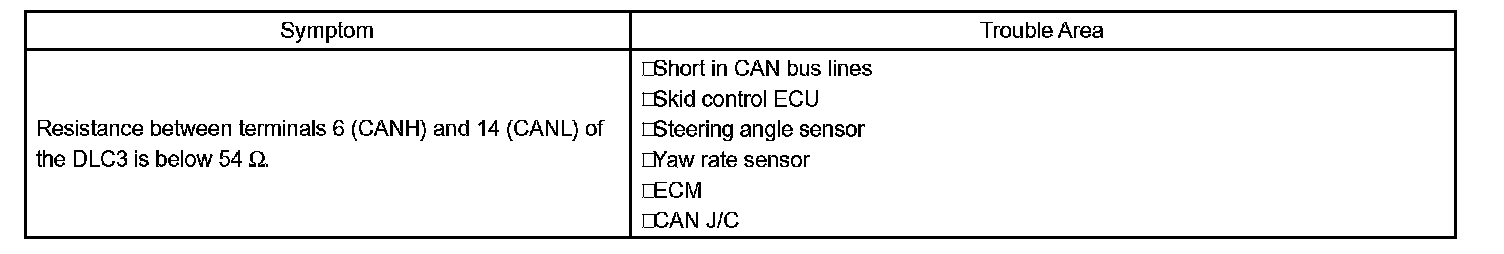CHECK CAN BUS LINES FOR SHORT CIRCUITCIRCUIT DESCRIPTIONThe CAN bus lines are considered to be shorted when the resistance between terminals 6 (CANH) and 14 (CANL) of the