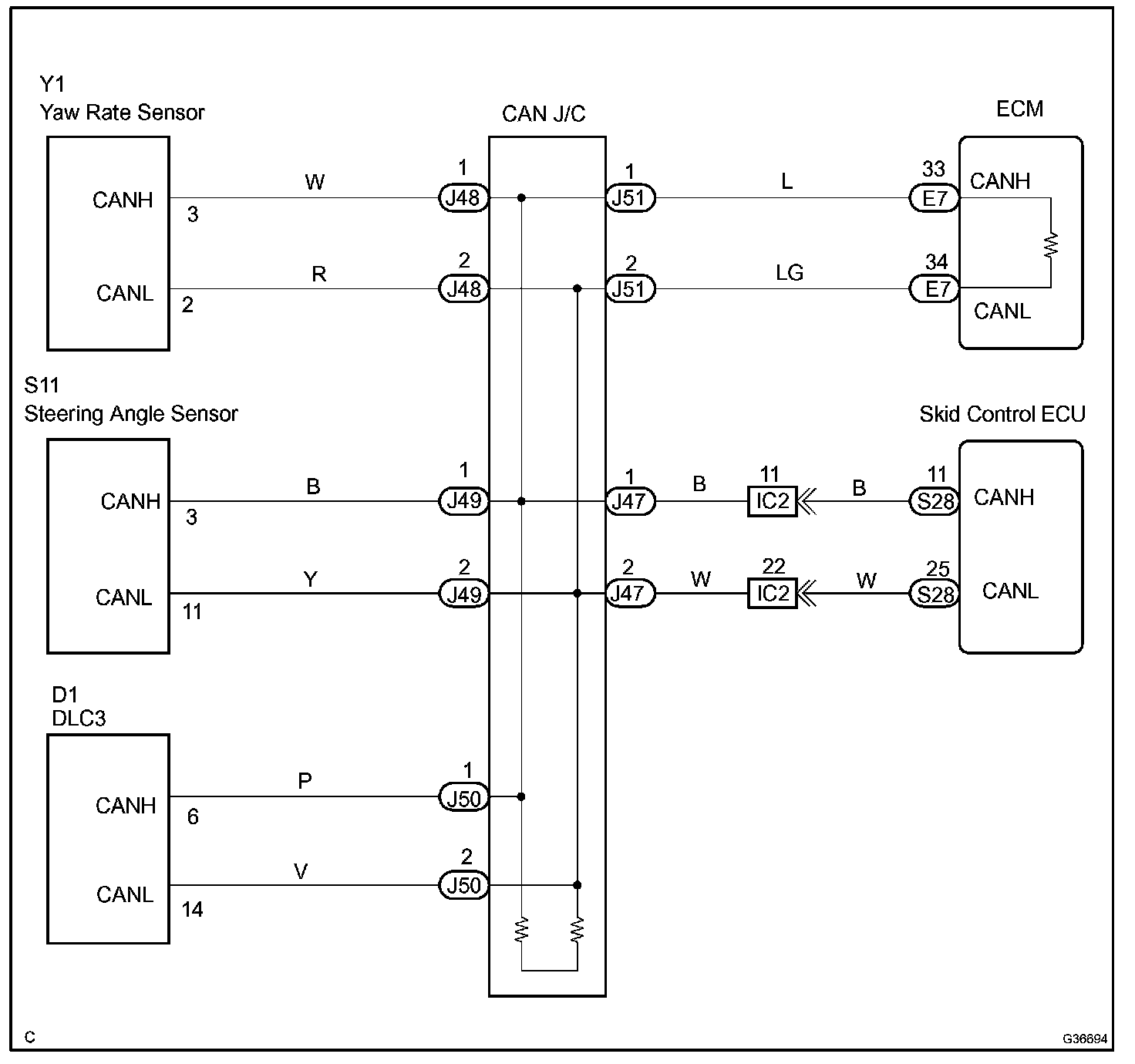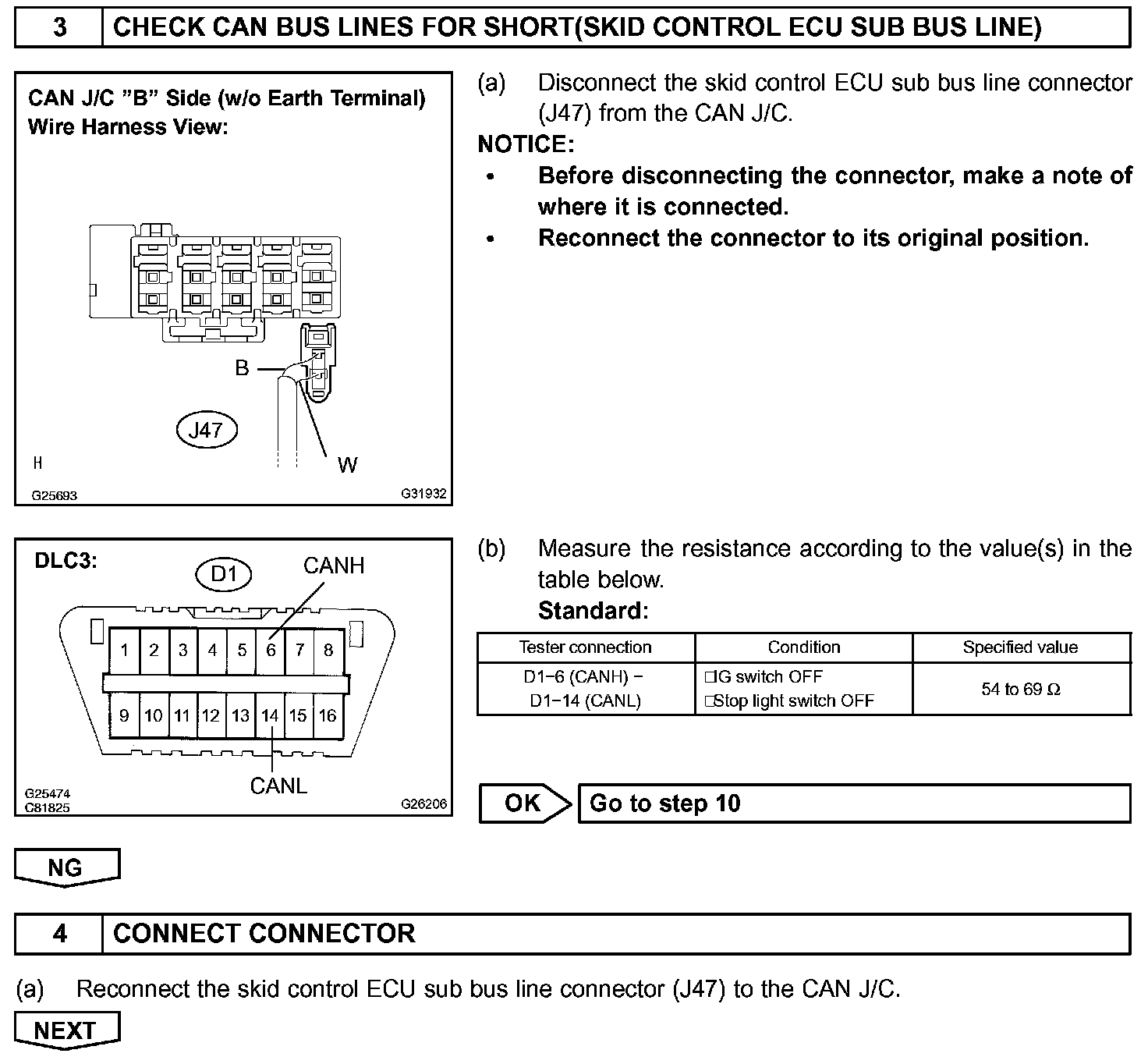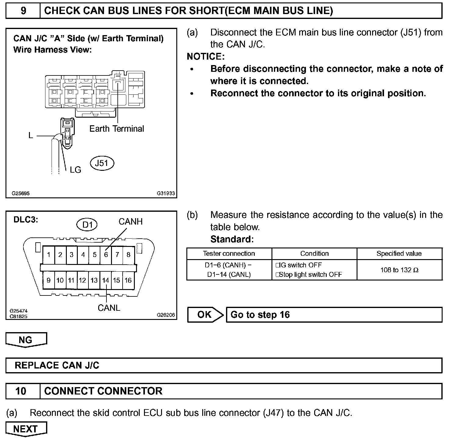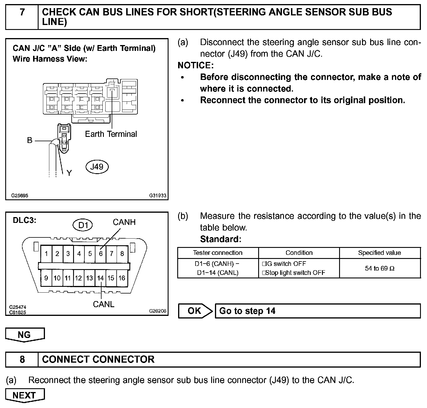 CHECK CAN BUS LINES FOR SHORT CIRCUITCIRCUIT DESCRIPTIONThe CAN bus lines are considered to be shorted when the resistance between terminals 6 (CANH) and 14 (CANL) of the