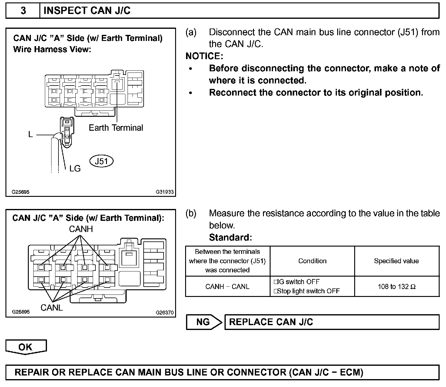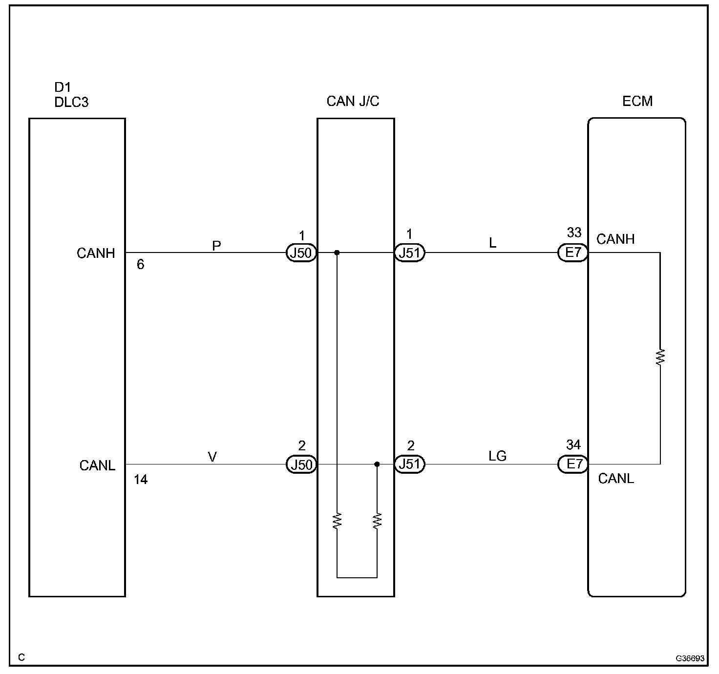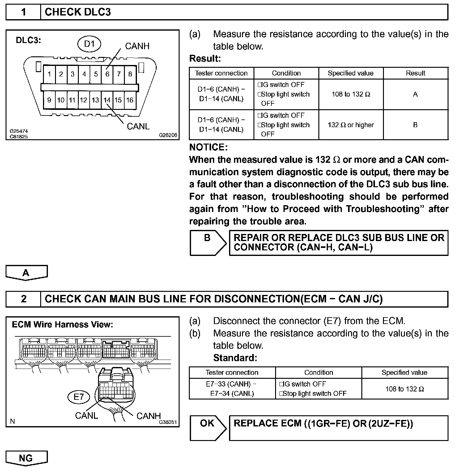 The CAN main bus line and DLC3 sub bus line may have a disconnection when the resistance between terminals 6 (CANH) and 14 (CANL) of the DLC3 is more than 69 Ohms.