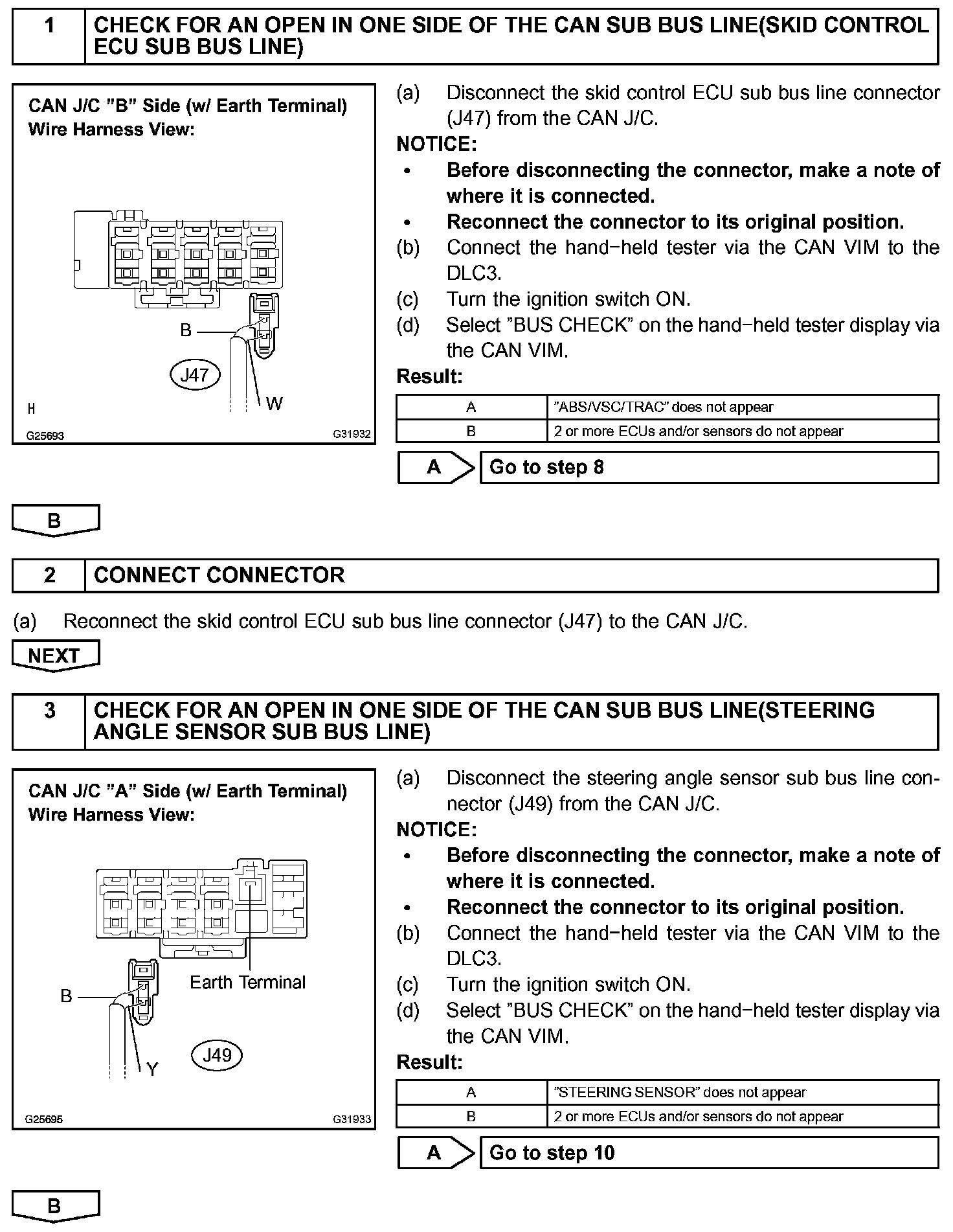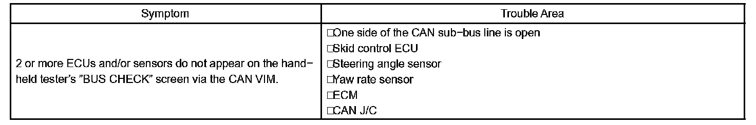 If 2 or more ECUs and/or sensors do not appear on the hand-held tester's "BUS CHECK" screen via the CAN VIM, one side of the CAN sub-bus line may be open. (One side of the CAN-H [sub-bus line]/CAN-L [sub-bus line] of the ECU and/or sensor is open.)