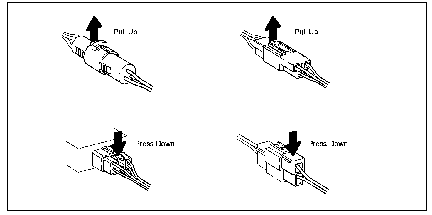 DISCONNECTION OF MALE AND FEMALE CONNECTORS To pull apart the connectors, pull on the connector itself, the wire harness.