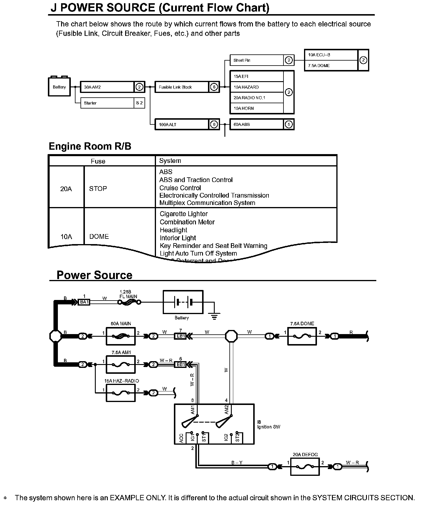 HOW TO READ POWER SOURCEThe "Current Flow Chart" section, describes which parts each power source (fuses, fusible links, and circuit breakers) transmits current to. In the Power Source circuit diagram, the conditions when battery power is supplied to each system are explained. Since all System Circuit diagrams start from the power source, the power source system must be fully understood.