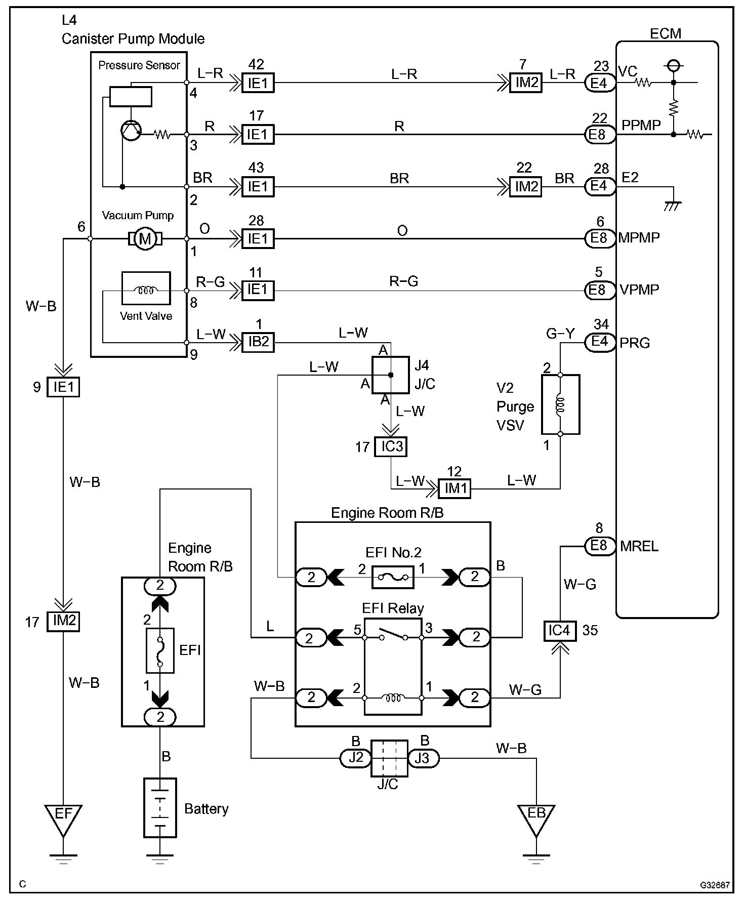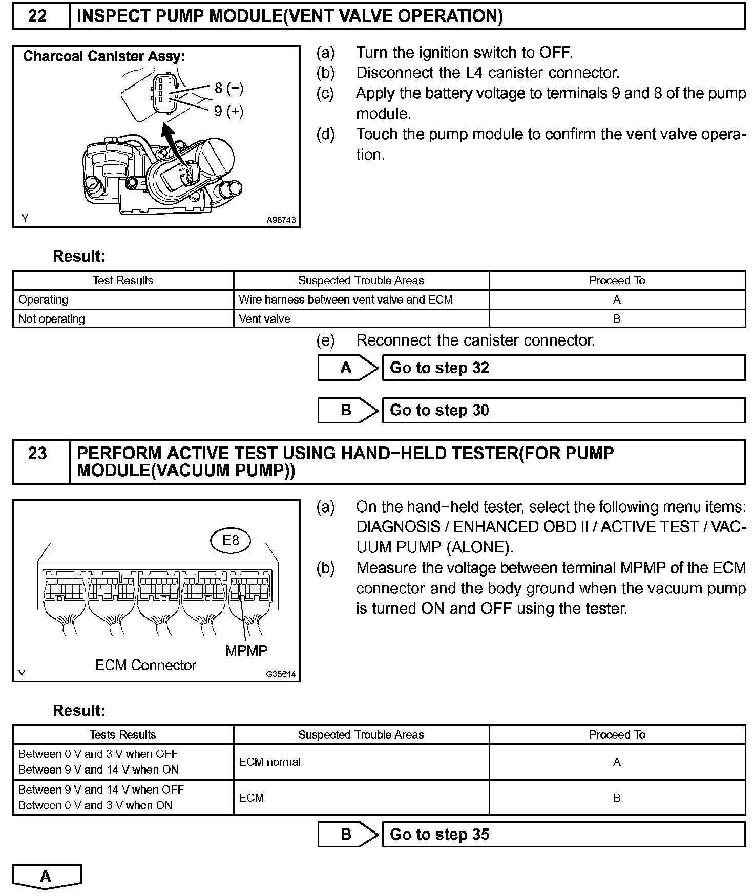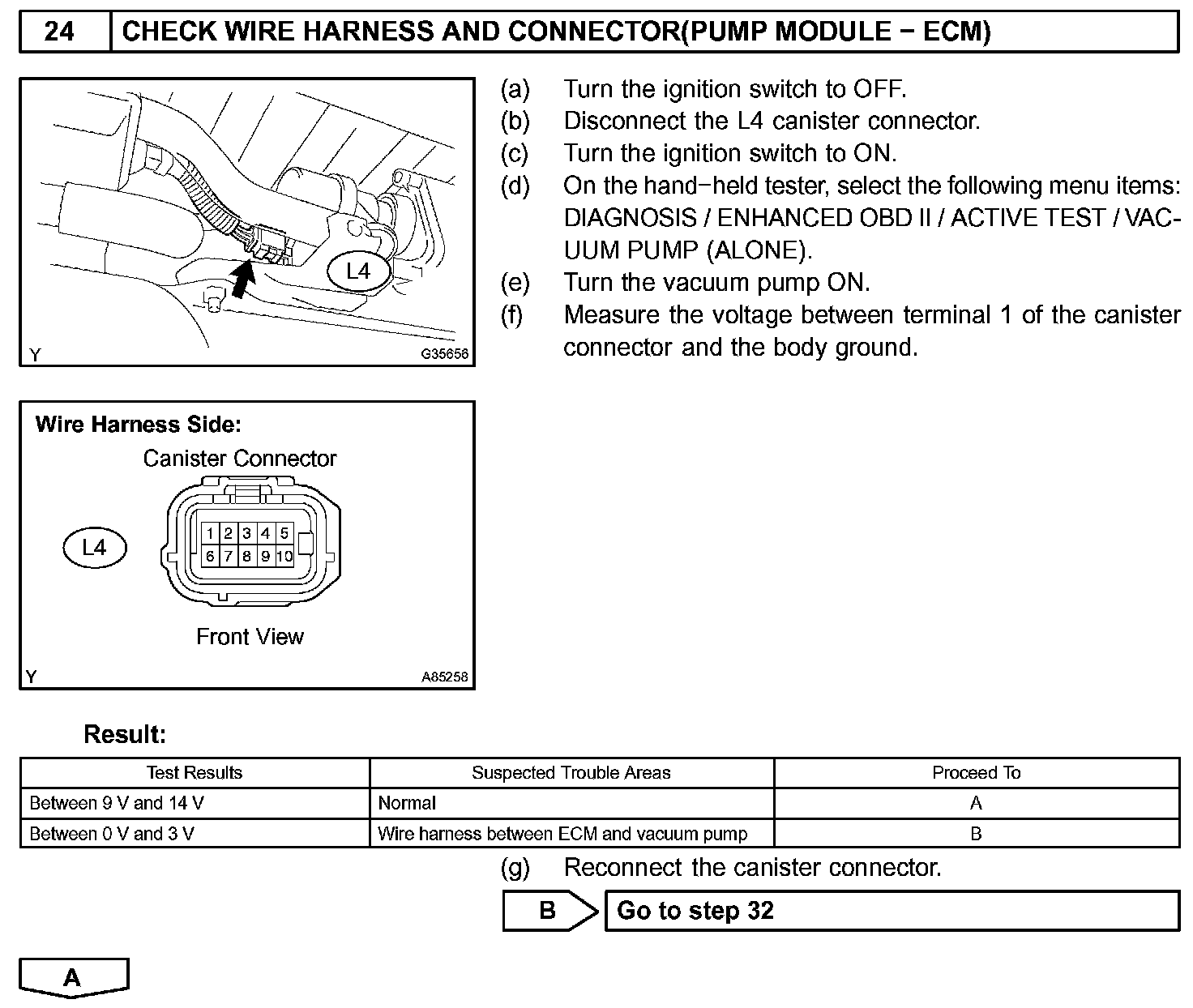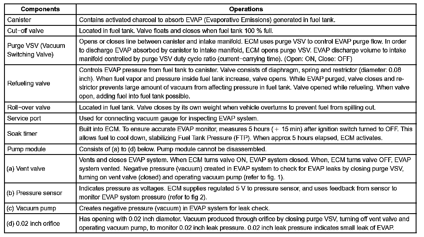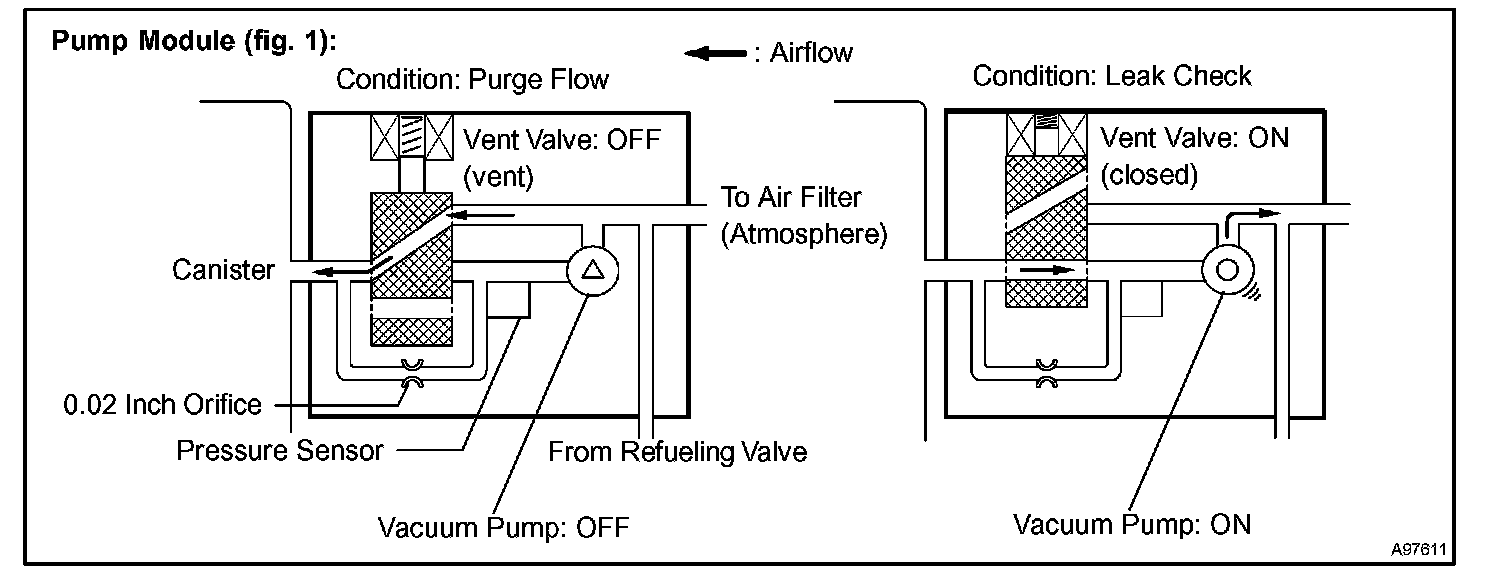 The electric vacuum pump creates negative pressure (vacuum) in the EVAP system and the pressure is measured. Finally, the ECM monitors for leaks from the EVAP system, and malfunctions in both the pump module and purge VSV, based on the EVAP pressure.