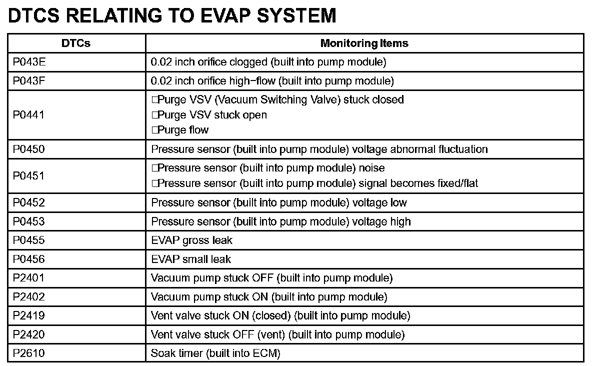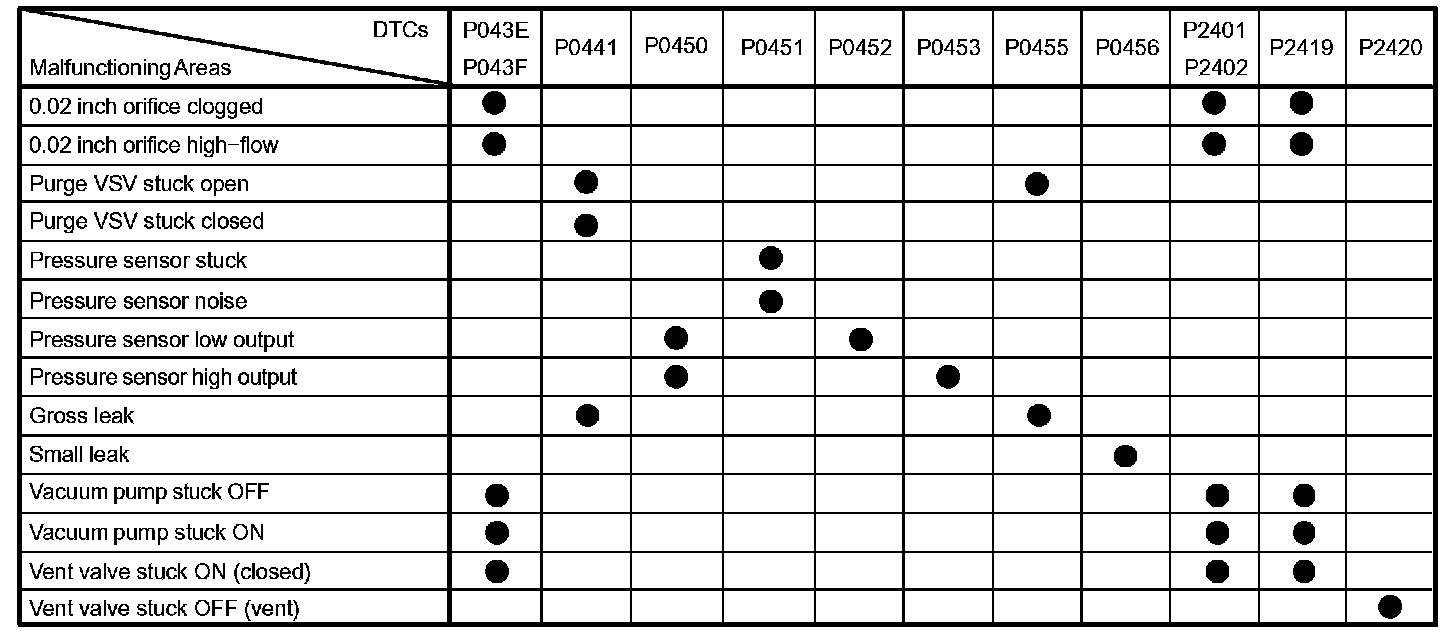 If any EVAP system DTCs are set, the malfunctioning area can be determined using the table given.