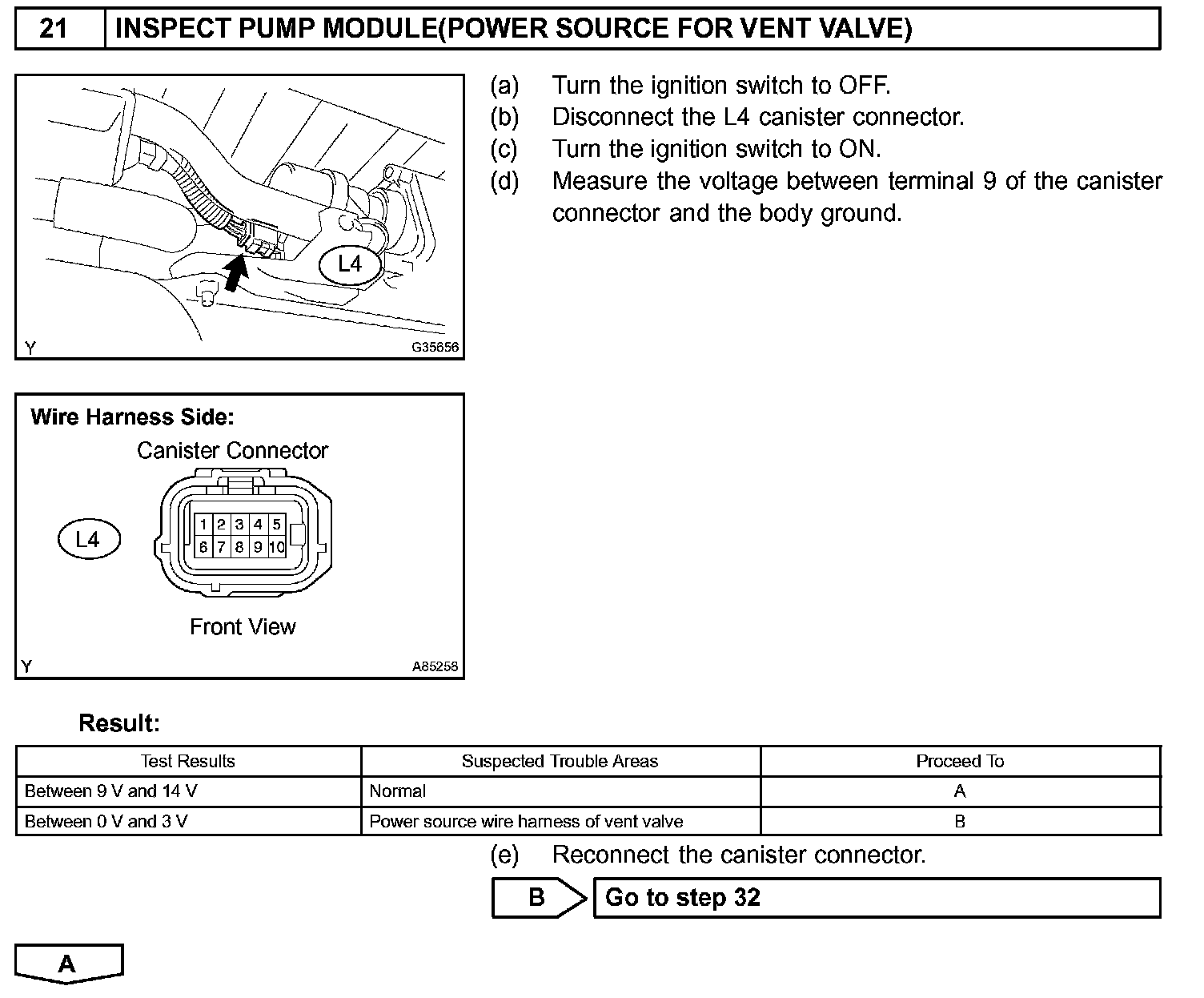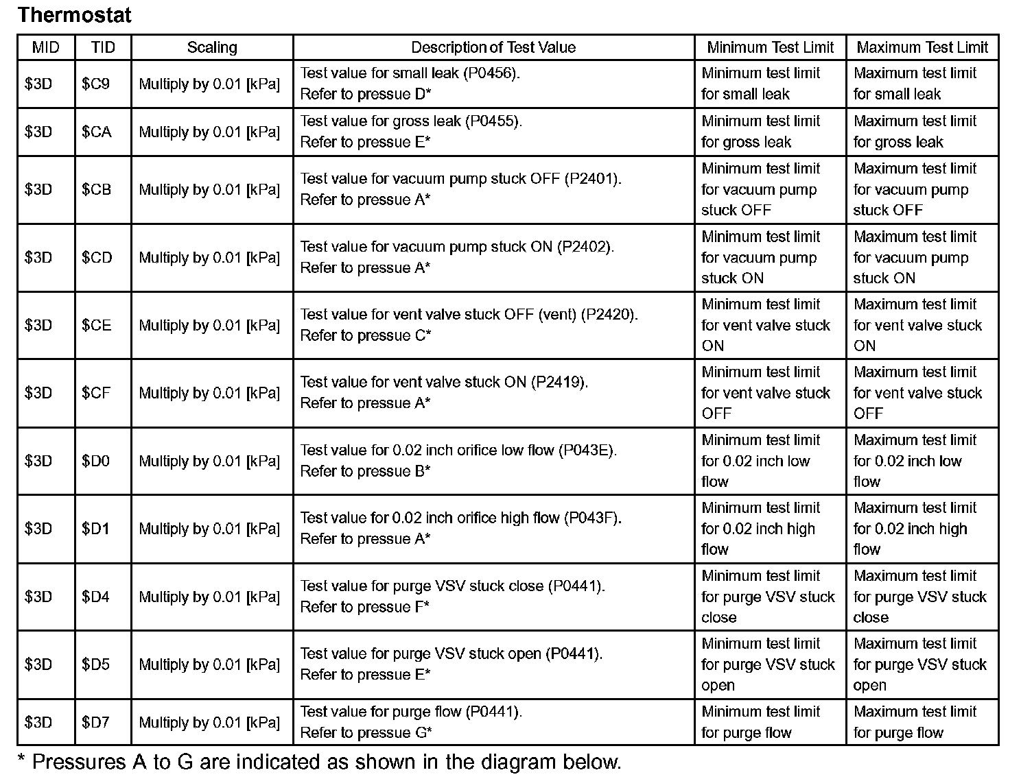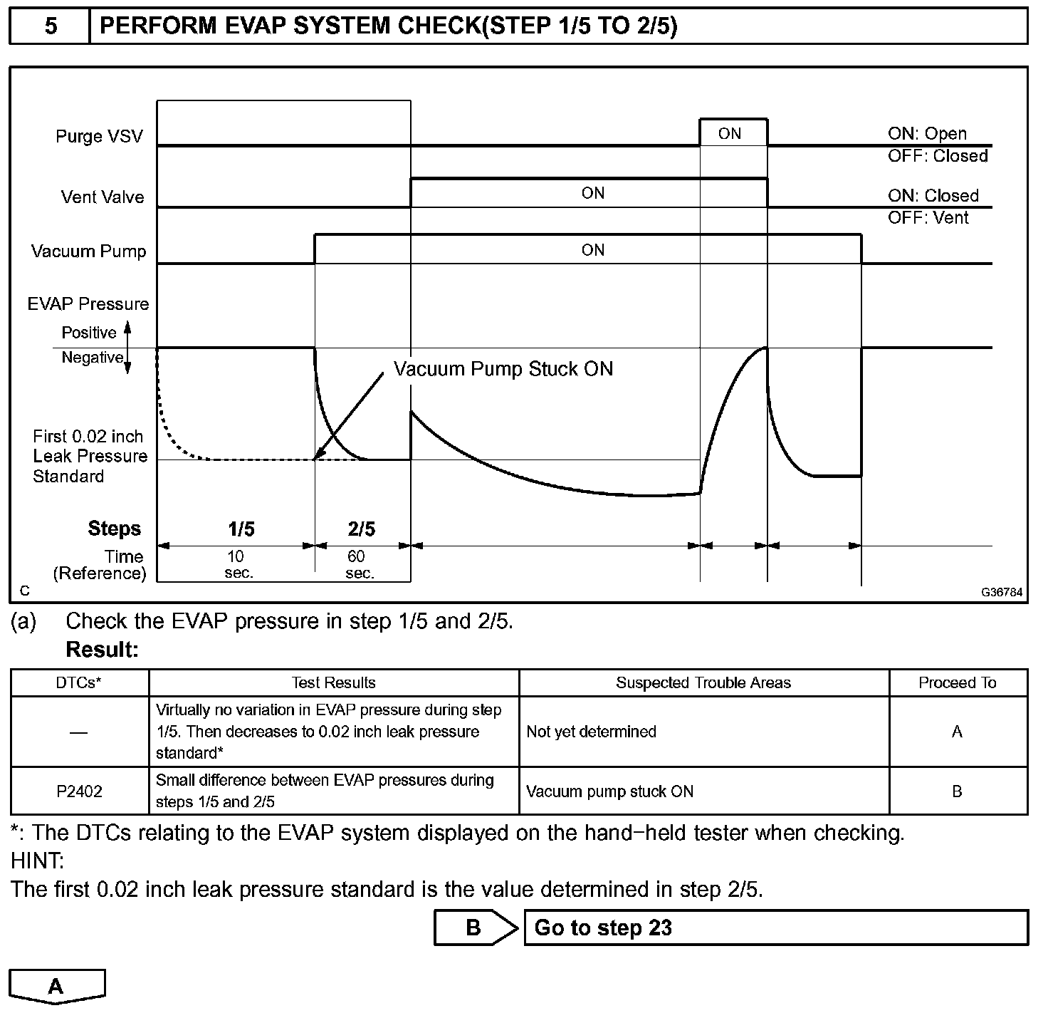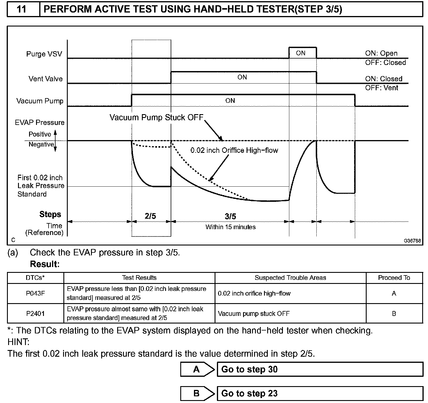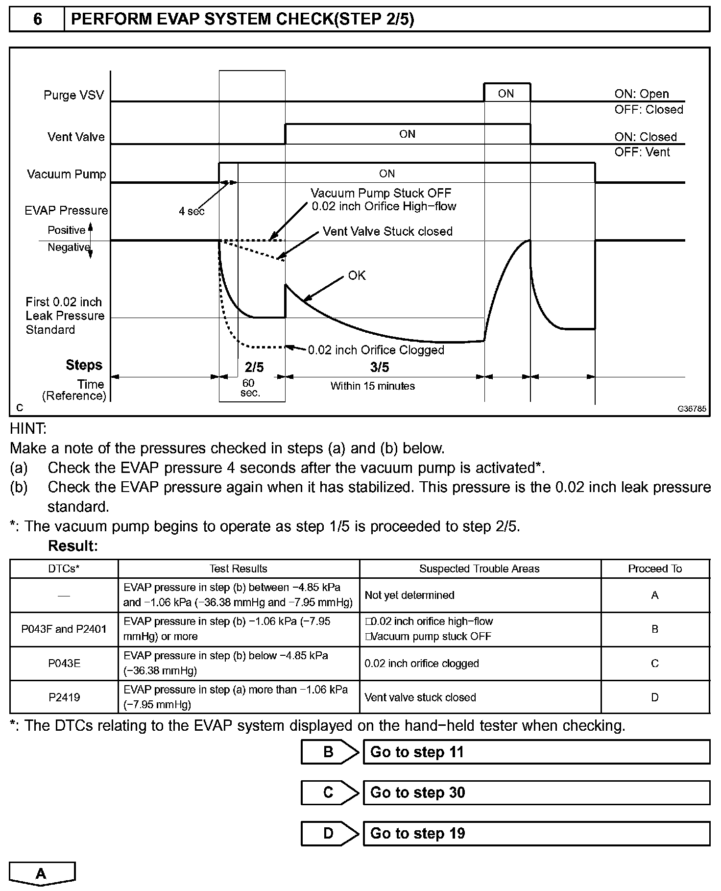 NOTE: If the 0.02 inch reference pressure difference between the first and second checks is greater than the specification, the DTCs corresponding to the reference pressure (P043E, P043F, P0441, P0455, P0456, P2401, P2420) will be all stored.