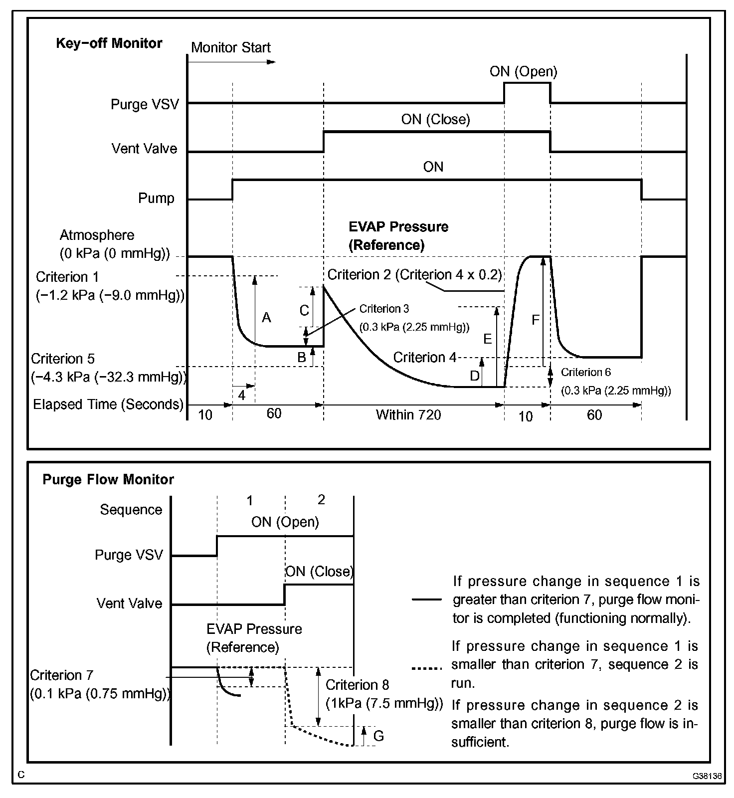 The purge flow monitor consists of the two monitors. The 1st monitor is always conducted every time and the 2nd monitor is activated if necessary.