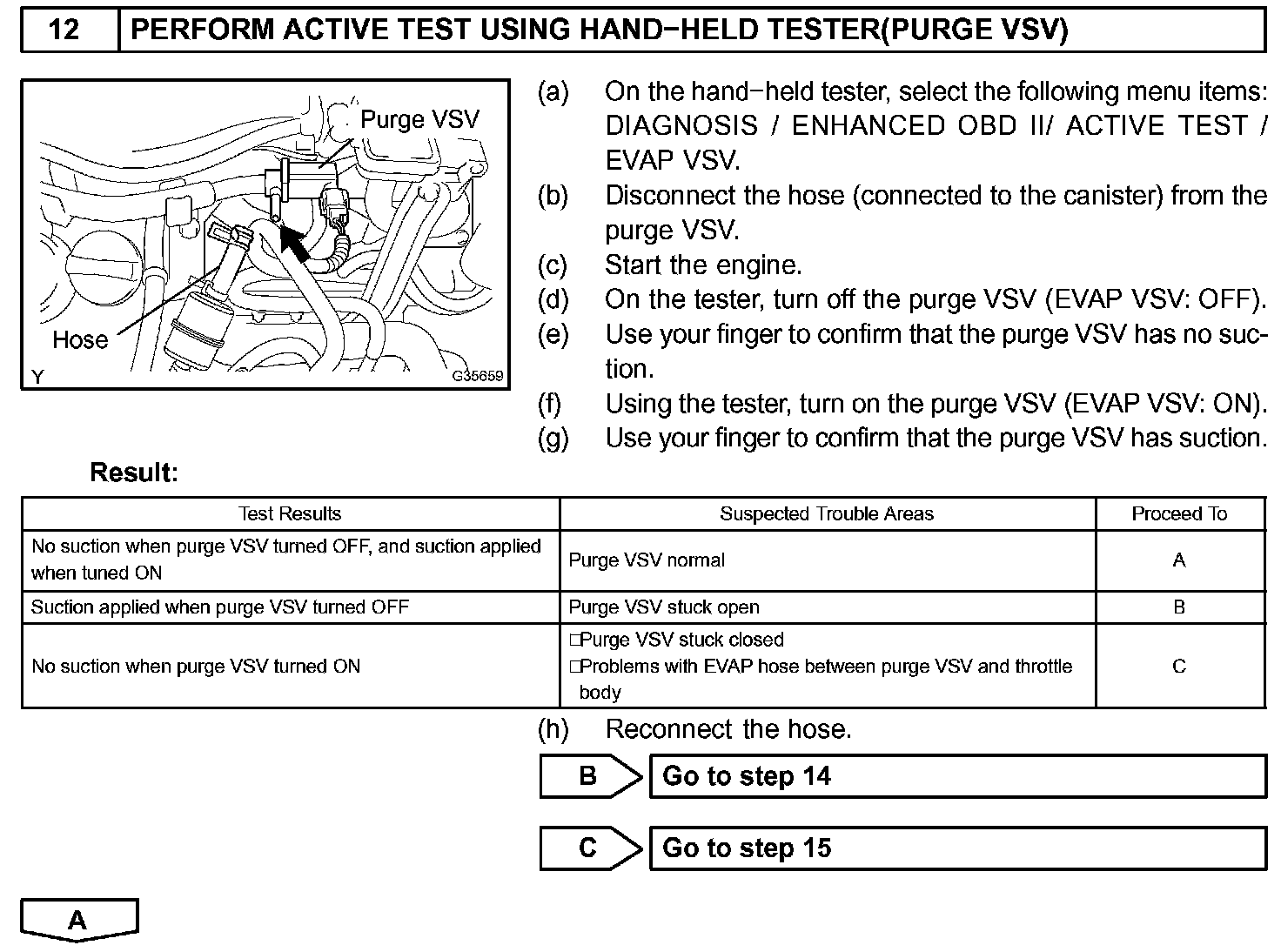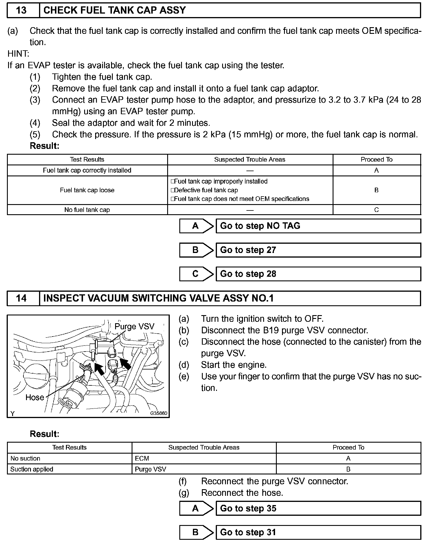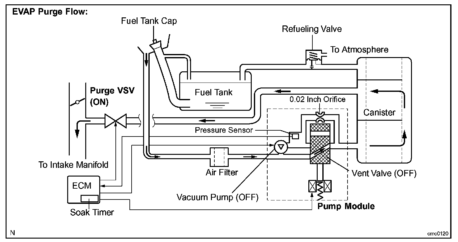 While the engine is running and the purge VSV (Vacuum Switching Valve) is ON (open), the ECM monitors the purge flow by measuring the EVAP pressure change. If negative pressure is not created, the ECM begins the 2nd monitor.