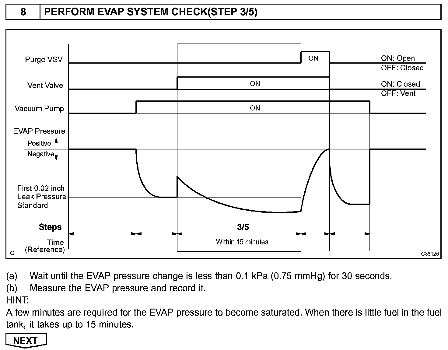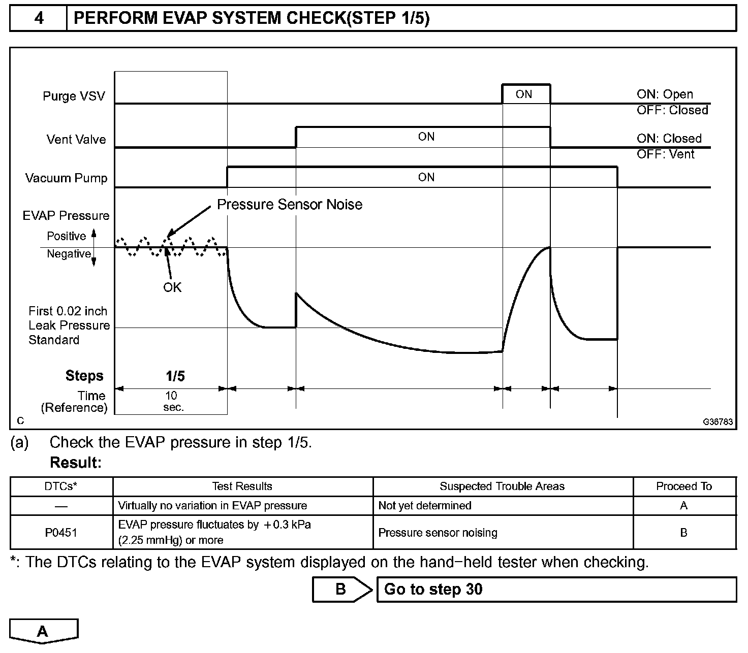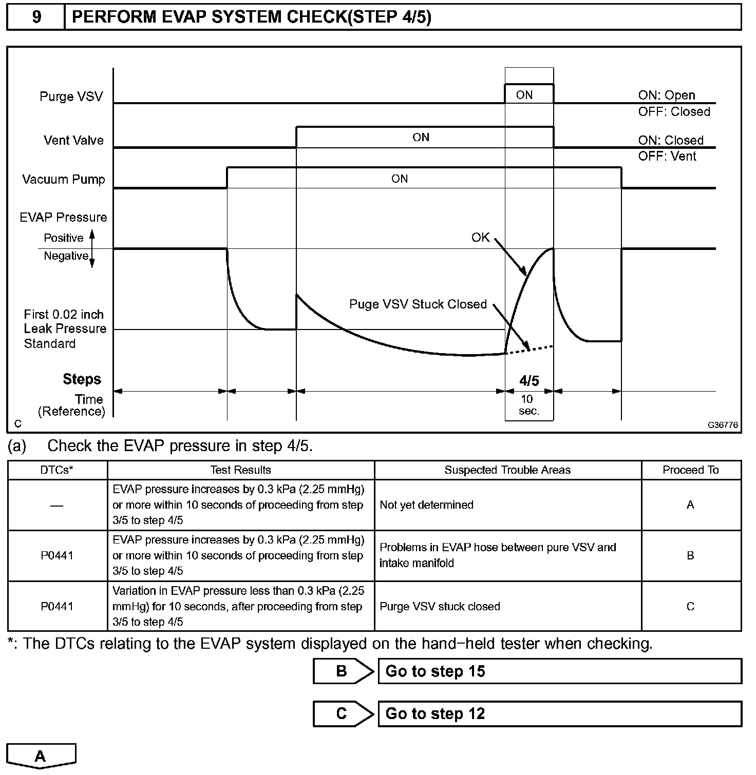 The vent valve is turned OFF (open) and the EVAP pressure is then measured. If the variation in the pressure is less than 0.5 kpa (3.75 mmHg), the ECM interprets this as the purge VSV being stuck closed, and illuminates the MIL and sets DTC P0441 (2 trip detection logic).