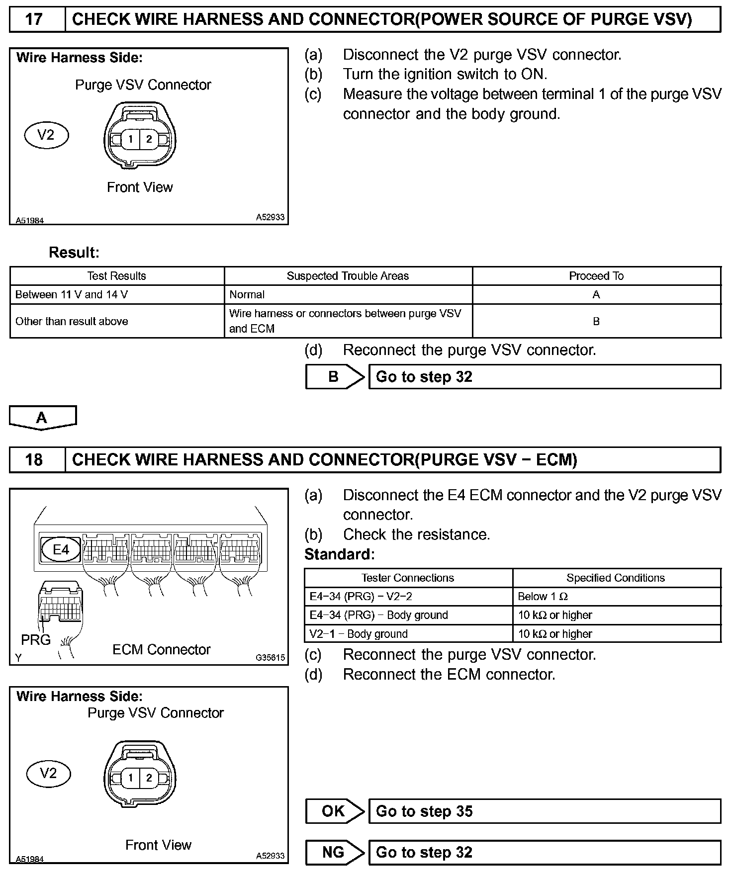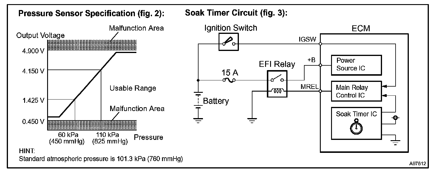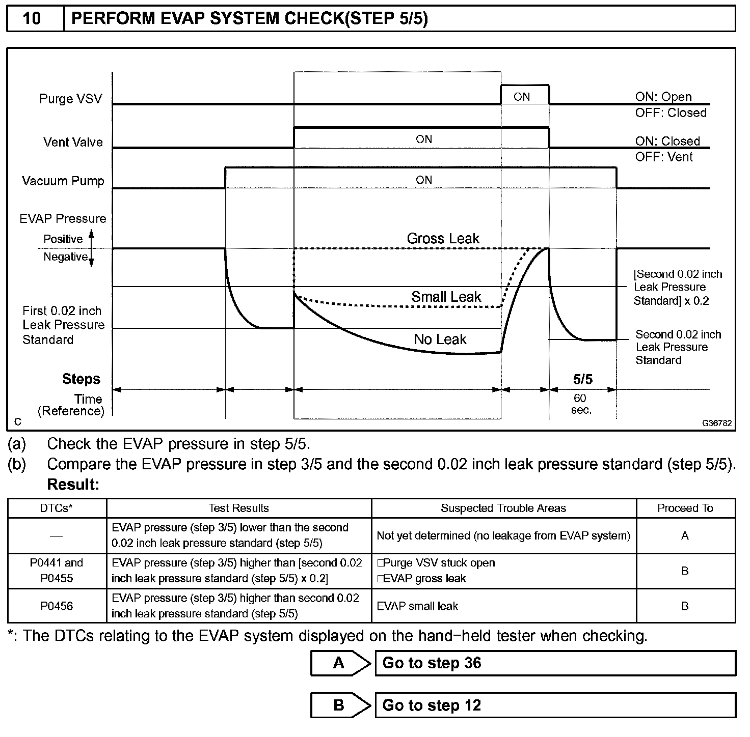The vent valve is turned OFF (open) and the EVAP pressure is then measured. If the variation in the pressure is less than 0.5 kpa (3.75 mmHg), the ECM interprets this as the purge VSV being stuck closed, and illuminates the MIL and sets DTC P0441 (2 trip detection logic).