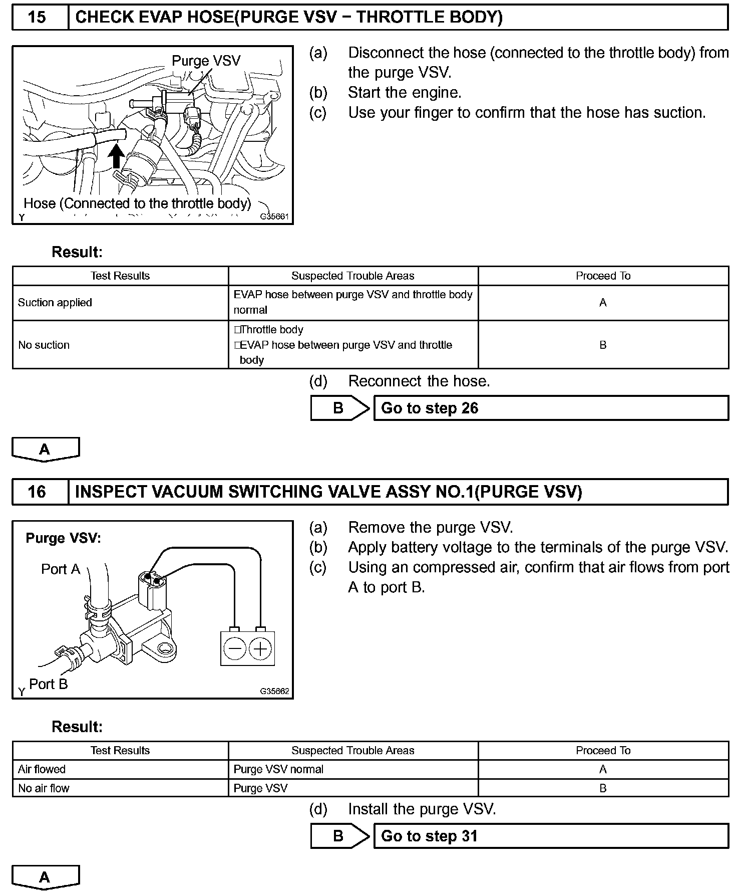 While the engine is running, if a predetermined condition (closed-loop, etc.) is met, the purge VSV is opened by the ECM and stored fuel vapors in the canister are purged to the intake manifold. The ECM changes the duty cycle ratio of the purge VSV to control purge flow volume.