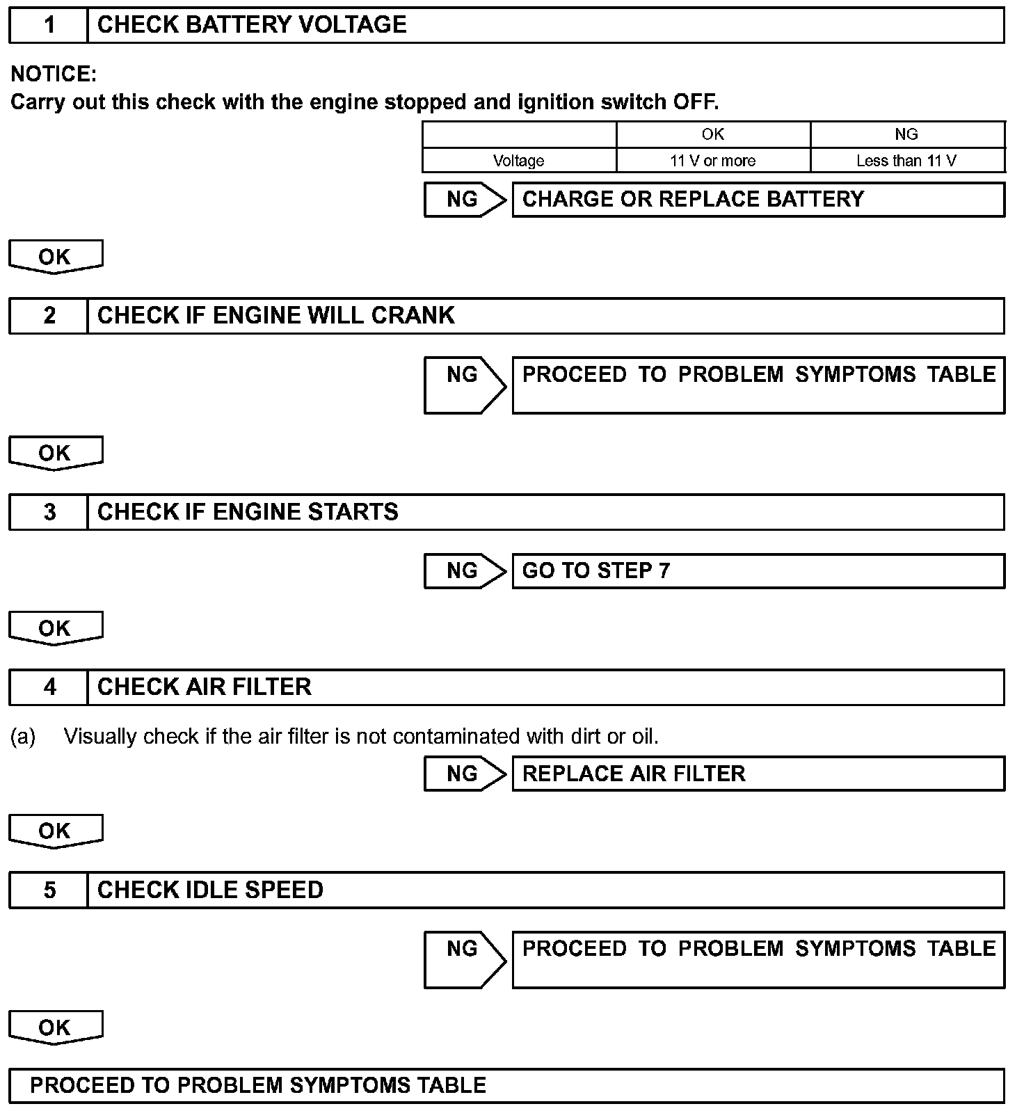 When the malfunction is not confirmed in the DTC check, troubleshooting should be carried out in all the possible circuits considered as causes of the problem. In many cases, by carrying out the basic engine check shown in the following flowchart, the location causing the problem can be found quickly and efficiently. Therefore, using this check is essential in the engine troubleshooting.