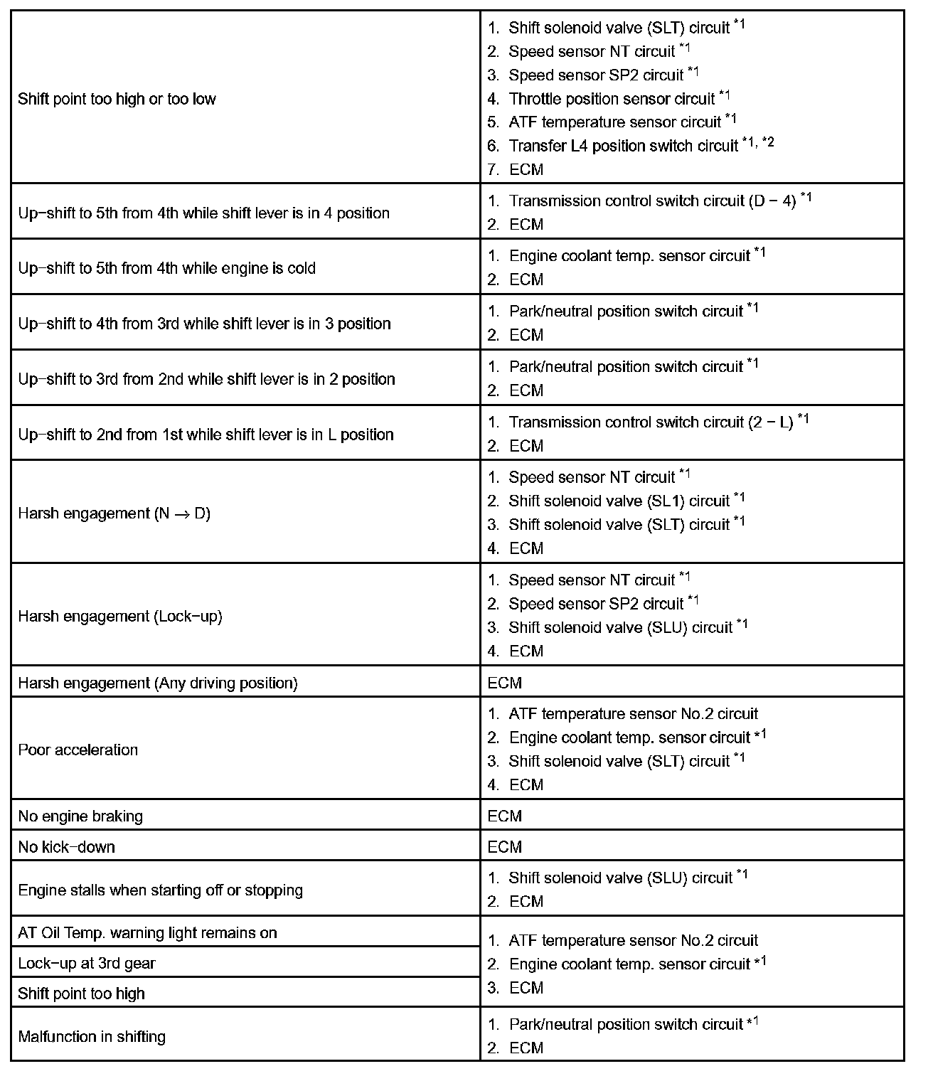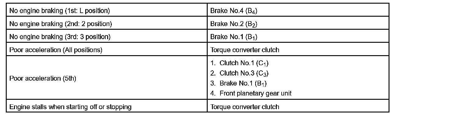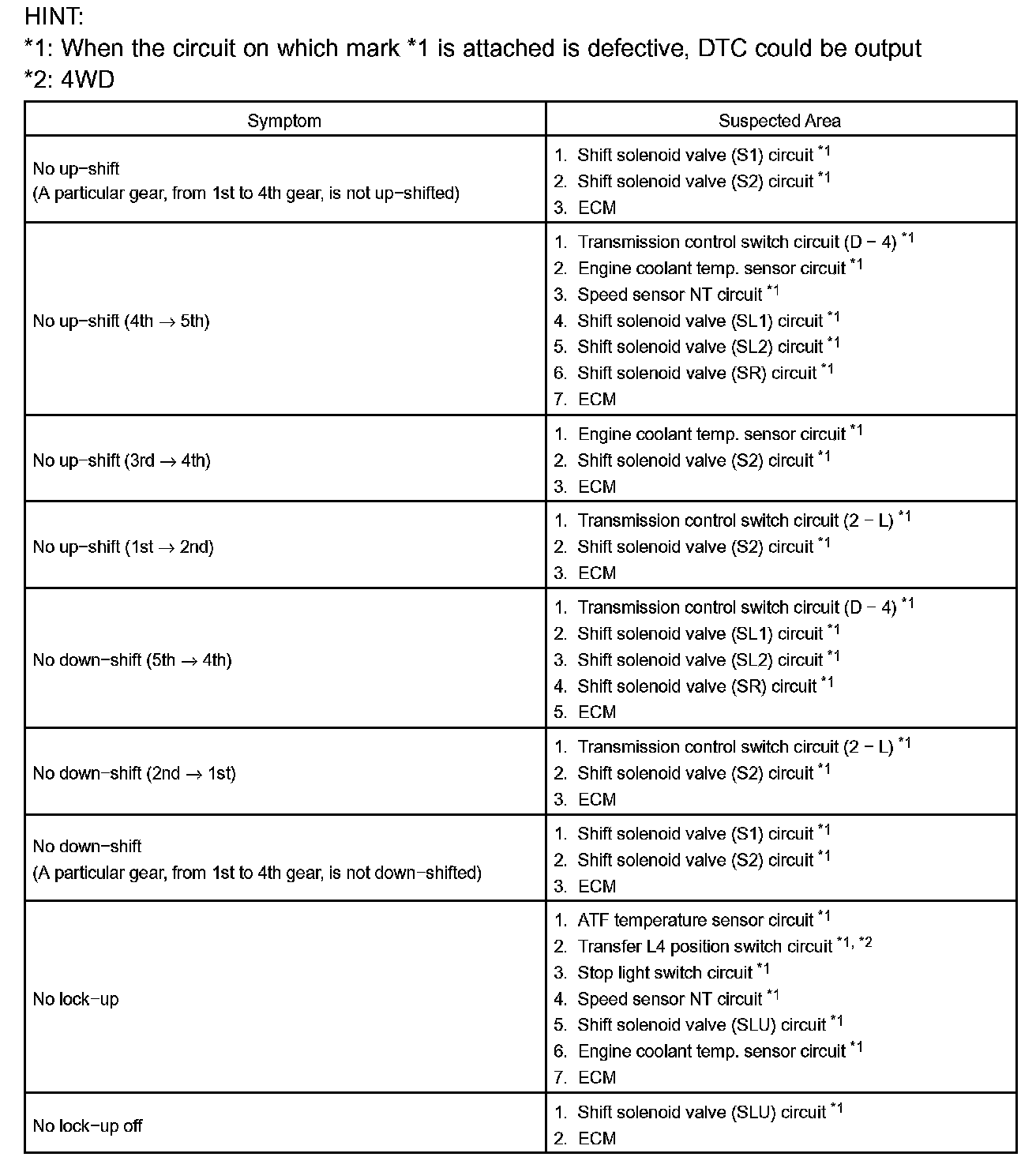 PROBLEM SYMPTOMS TABLEHINT: If a normal code is displayed during the diagnostic trouble code check although the trouble still occurs, check the electrical circuits for each symptom in the order given in the charts and proceed to the troubleshooting.