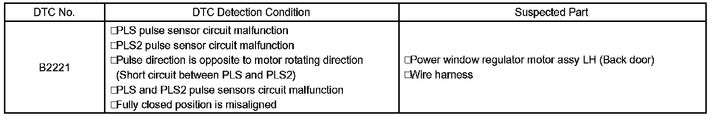If the pulse sensor in the back door power window motor malfunctions (DTC B2221 is output), the power window functions will be restricted: