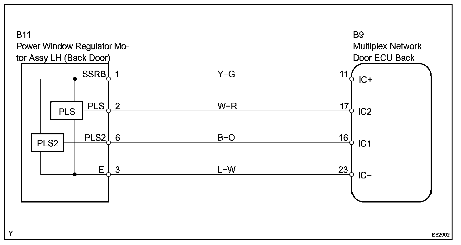 The back door ECU monitors the condition of the power window motor and detects the position of the door glass by using pulse signals output from the 2 pulse sensors in the power window motor.