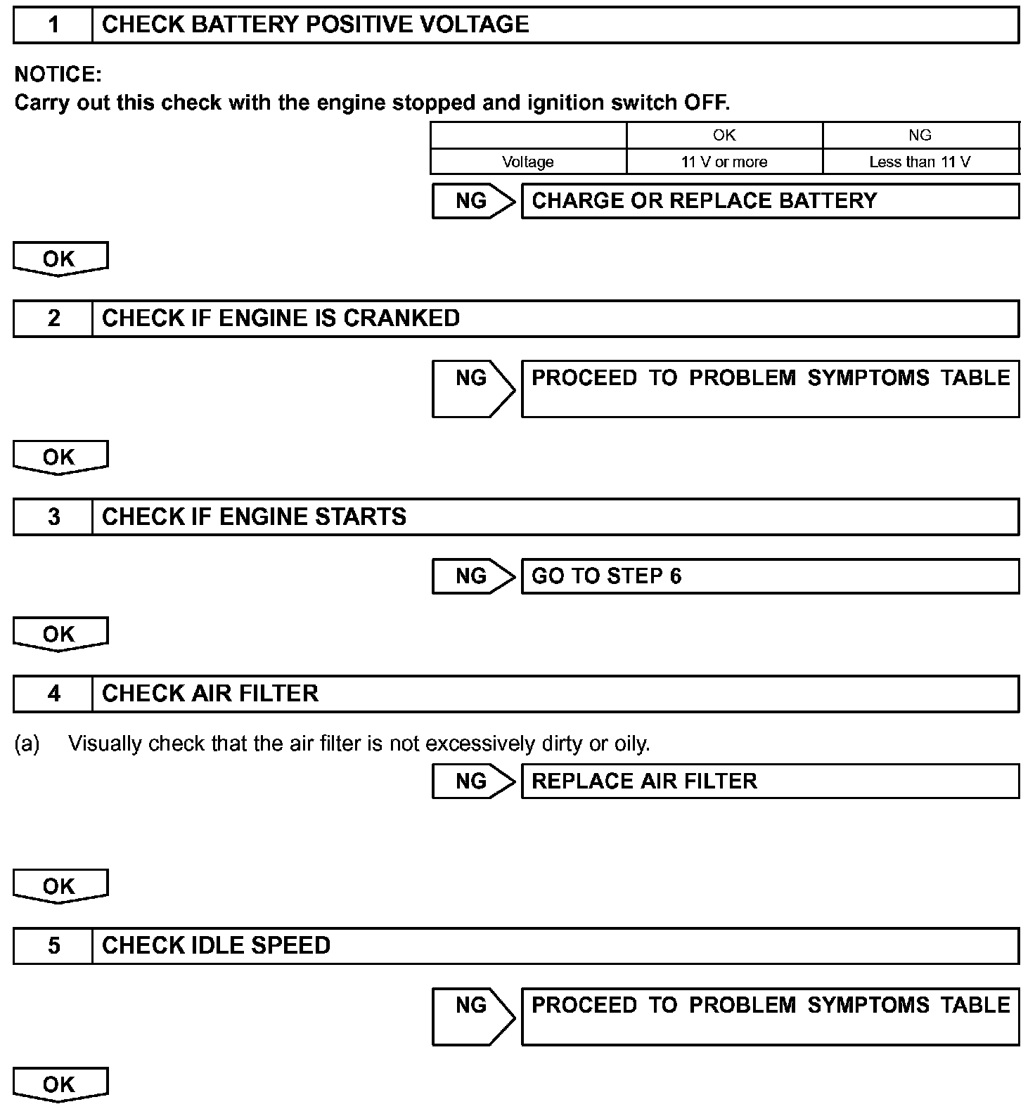 When the malfunction is not confirmed in the DTC check, troubleshooting should be carried out in all the possible circuits considered as causes of the problem. In many cases, by carrying out the basic engine check shown in the flowchart, the location causing the problem can be found quickly and efficiently. Therefore, using this check is essential in the engine troubleshooting.