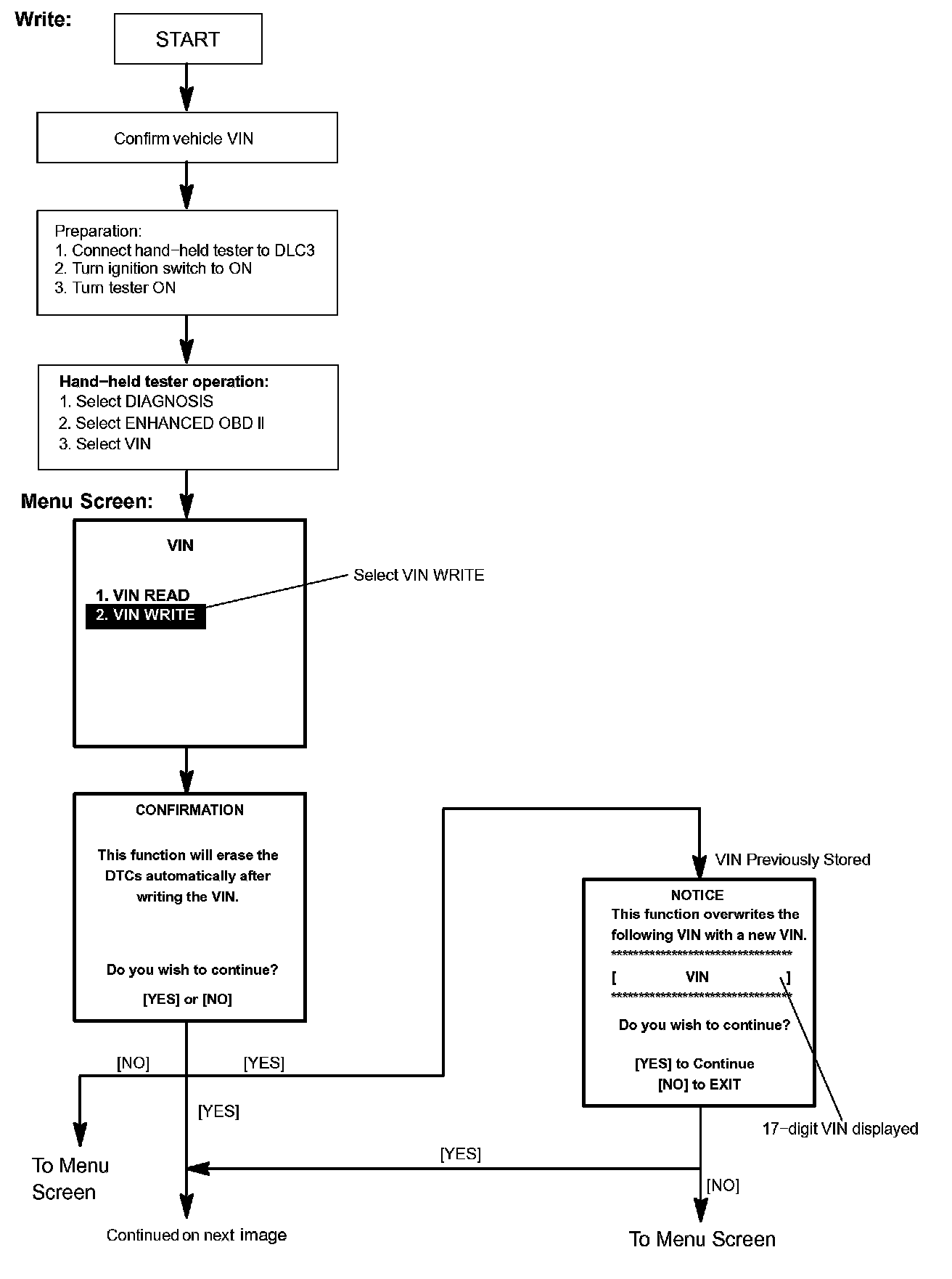 c. Write VIN: Explains the VIN writing process in a flowchart. This process allows the VIN to be input into the ECM. If the ECM is changed, or the VIN and VIN do not match, the VIN can be registered, or overwritten in the ECM by following this procedure.
