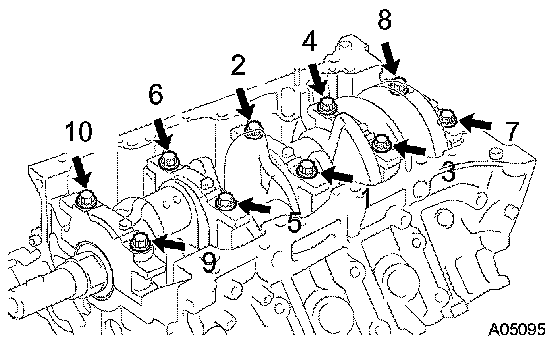 Retighten the crankshaft bearing cap bolts by 90° in the order shown.
