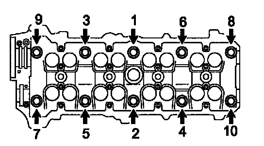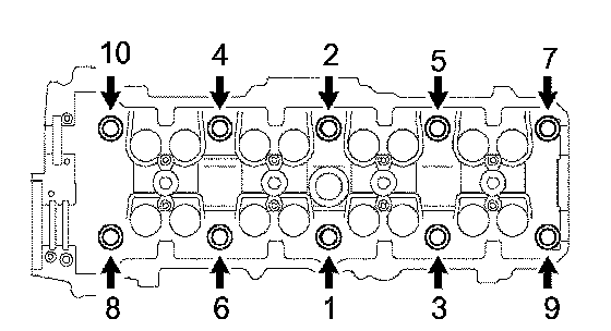 Install and uniformly tighten the 10 cylinder head bolts, and plate washers, in the order shown in the illustration.