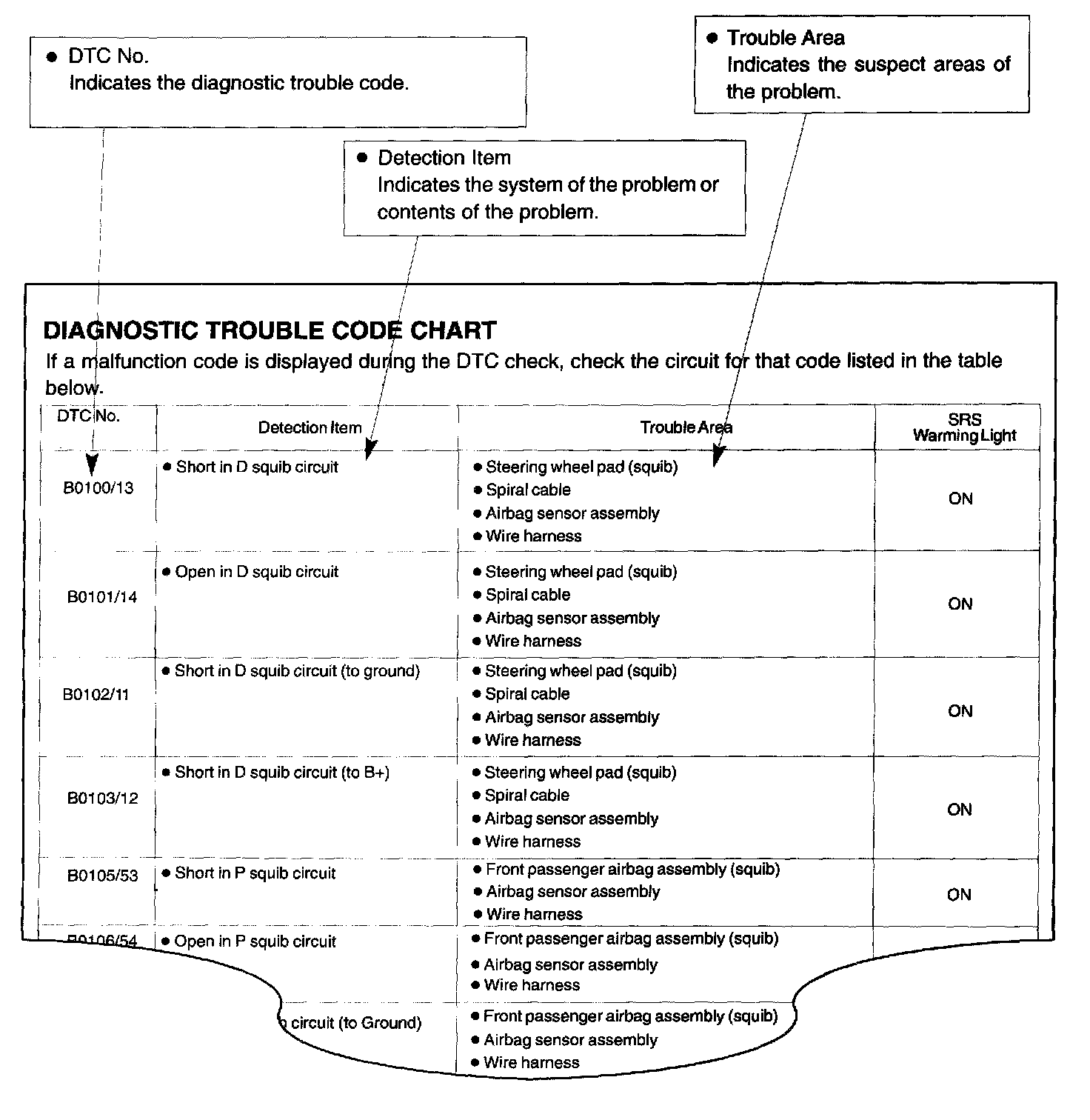 DIAGNOSTIC TROUBLE CODE CHARTThe inspection procedures are shown in the table. This table permits an efficient and accurate troubleshooting using the diagnostic trouble codes displayed in the diagnostic trouble code chart. Proceed with troubleshooting in accordance with the inspection procedures given in the diagnostic chart corresponding to the diagnostic trouble codes displayed. The Supplemental Restraint System diagnostic trouble code chart is shown as an example.