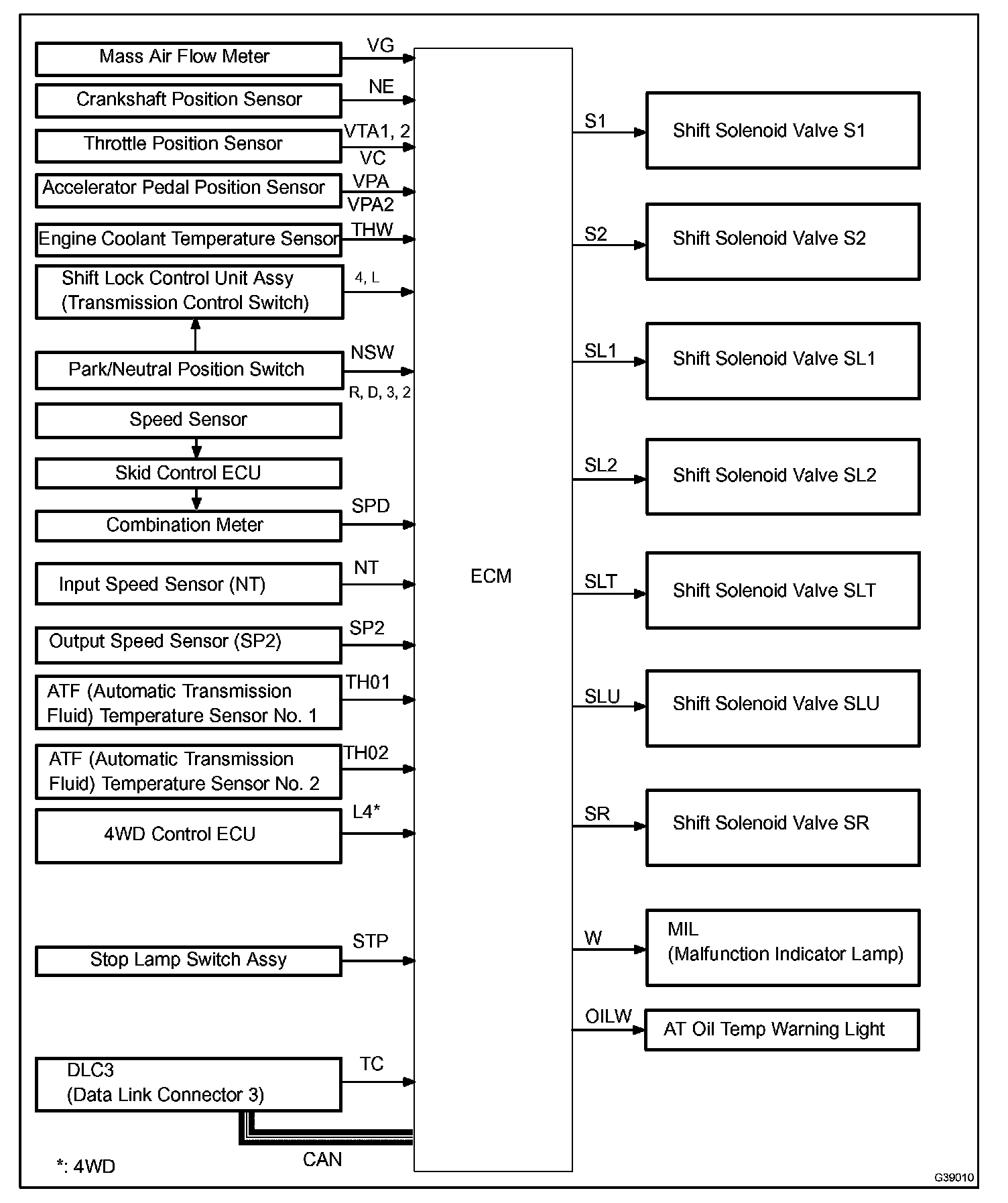 The configuration of the electronic control system in the A750E/A750F automatic transmission is as shown in the following chart.
