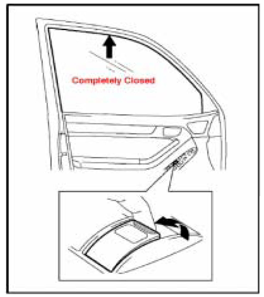 Turn the ignition switch to the "ON" position. Halfway close the door glass by pressing the switch. Then fully pull up on the switch until the door glass is fully closed, and continue holding the switch for approximately 12 seconds after the door glass is fully closed.