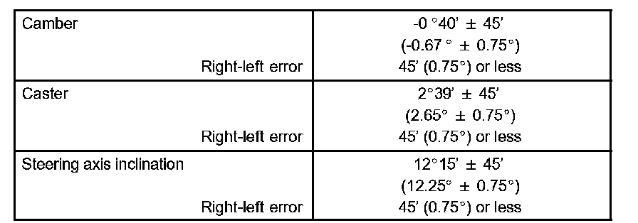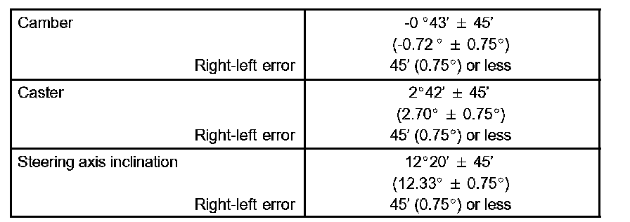 Check the suspension parts for damaged and/or worn out parts if the caster and steering axis inclination are not within the specified range after the camber has been correctly adjusted.
