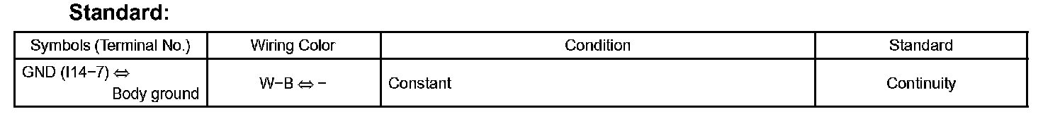 a. Disconnect the I14 amplifier connector, and check the continuity between the terminal of the wire harness side connector and body ground.