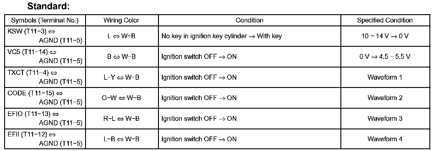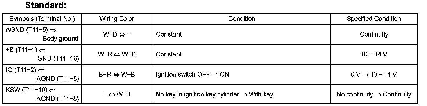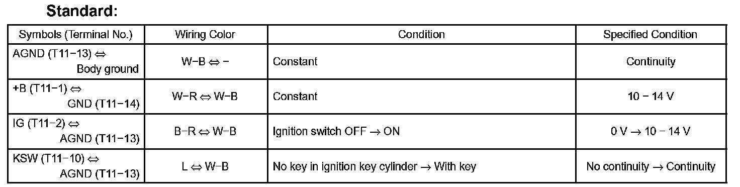 a. Disconnect the T11 ECU connector, and check the voltage or continuity between each terminal of the wire harness side connector.